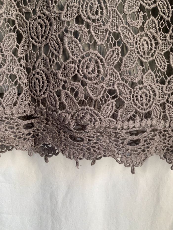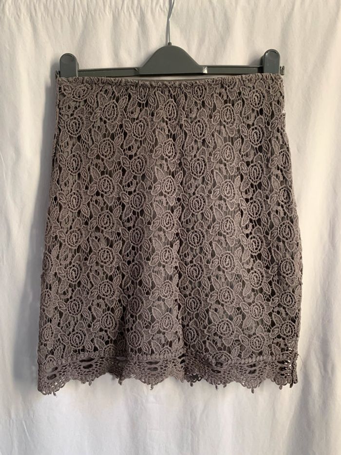 jolie jupe en dentelle grise/taupe. fermeture zip et crochet sur le côté. ❗️dentelle abîmé en bas de la jupe. longueur: 50 cm taille:S/36 #juperobe36rachel1911