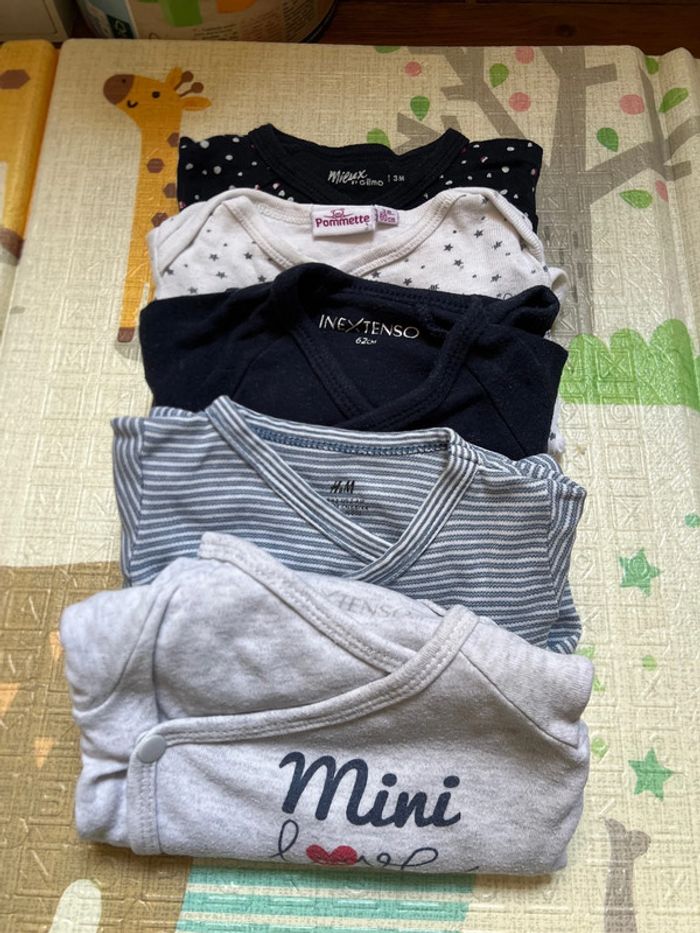 Lot de 5 Bodies manches longues In extenso, Pommette, H&M, Gémo Un abîmé à l’entrejambe (voir dernière photo) 3 mois