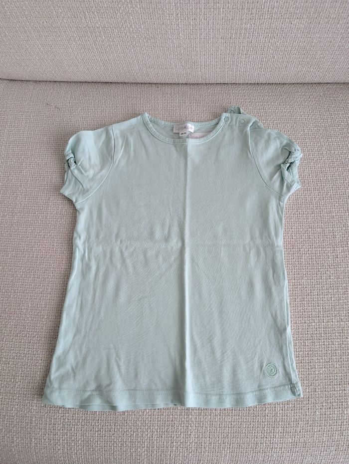 T-shirt bleu vert clair kimbalo Taille 36 mois Porté quelques fois en très bon état Pas de défauts a noté juste étiquette au nom de ma fille