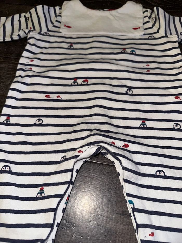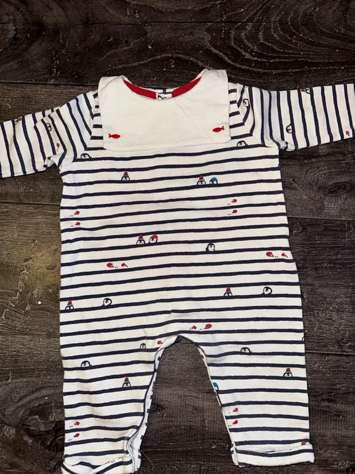 Mixte Motif :Pingouins , rayures, col marin Fermeture dans le dos et entre jambes Taille 6 mois Coton