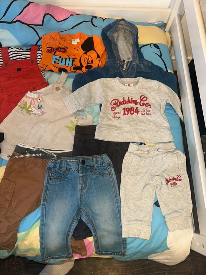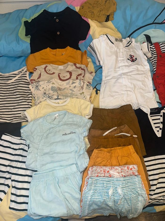 7 short 7 t-shirt 1 bodie assorti au short gaze de coton 2 barboteuses Col marinière 1 salopette avec son t-shirt 1 salopette en lin 1 bonnet en coton 1 t-shirt manches longues 1 ensemble de survêtement jack&jones 1 gilet à capuche 2 leggings ( 1 court ) 1 jean 1 jegging 1 jogging