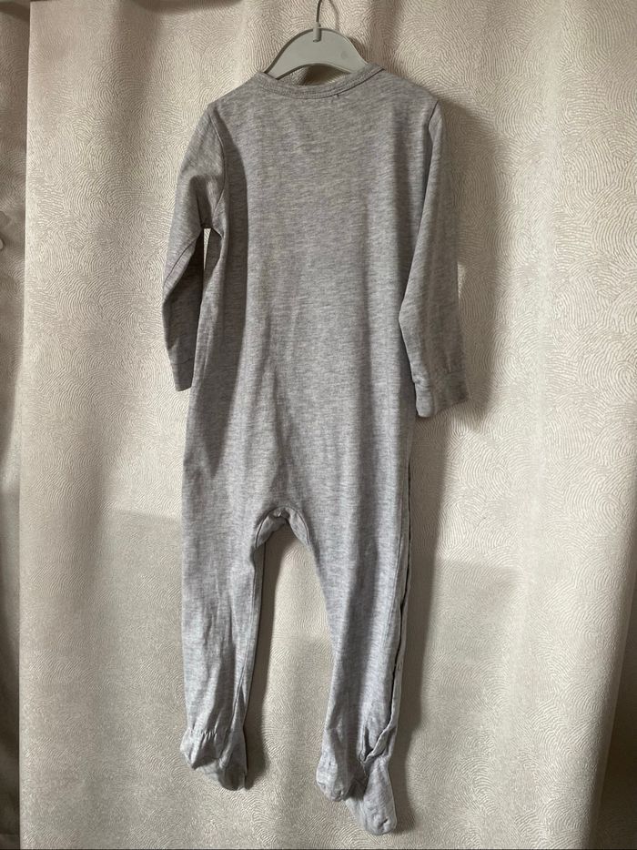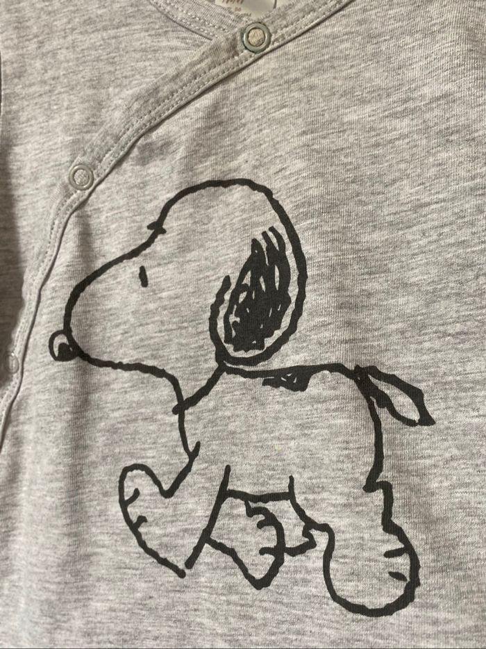 Pyjama d'été Snoopy gris chiné Ouverture devant 94% coton 6% viscose Taille 18 mois 86 cm H&M Bon état car un peu taché sous les pieds et sur le premier pression du haut