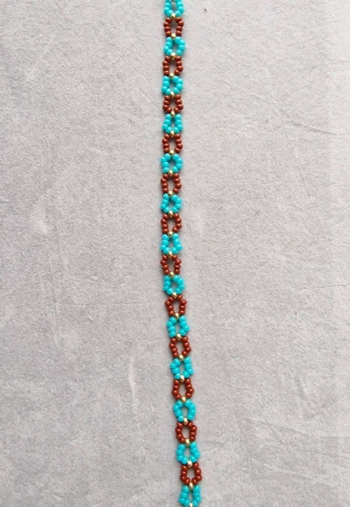 Bracelet en perles thème vacances d'été monoï marron bleu et doré Marque Crystalia Perles comme neuf Taille 17,5cm #perles&co #braceletfemme #braceletmarrondoré #perles #perlesderocailles #braceletmonoi #vacances