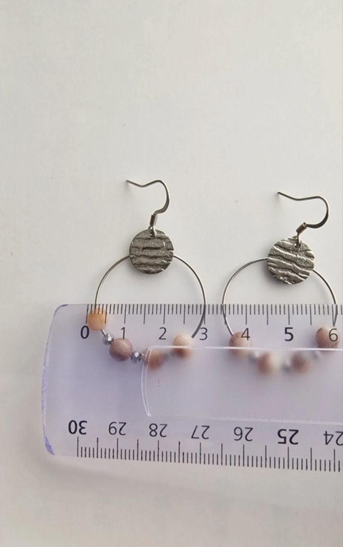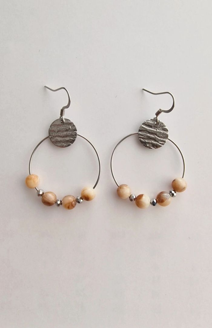 Boucle d'oreille créole en acier inoxydable argenté et perles beige marbré Marque Crystalia Perles comme neuf Diamètre 3cm #perles&co #creolesbeige #creoles #fetedesmeres #acierinoxydableargenté #créolesargenté #bohème