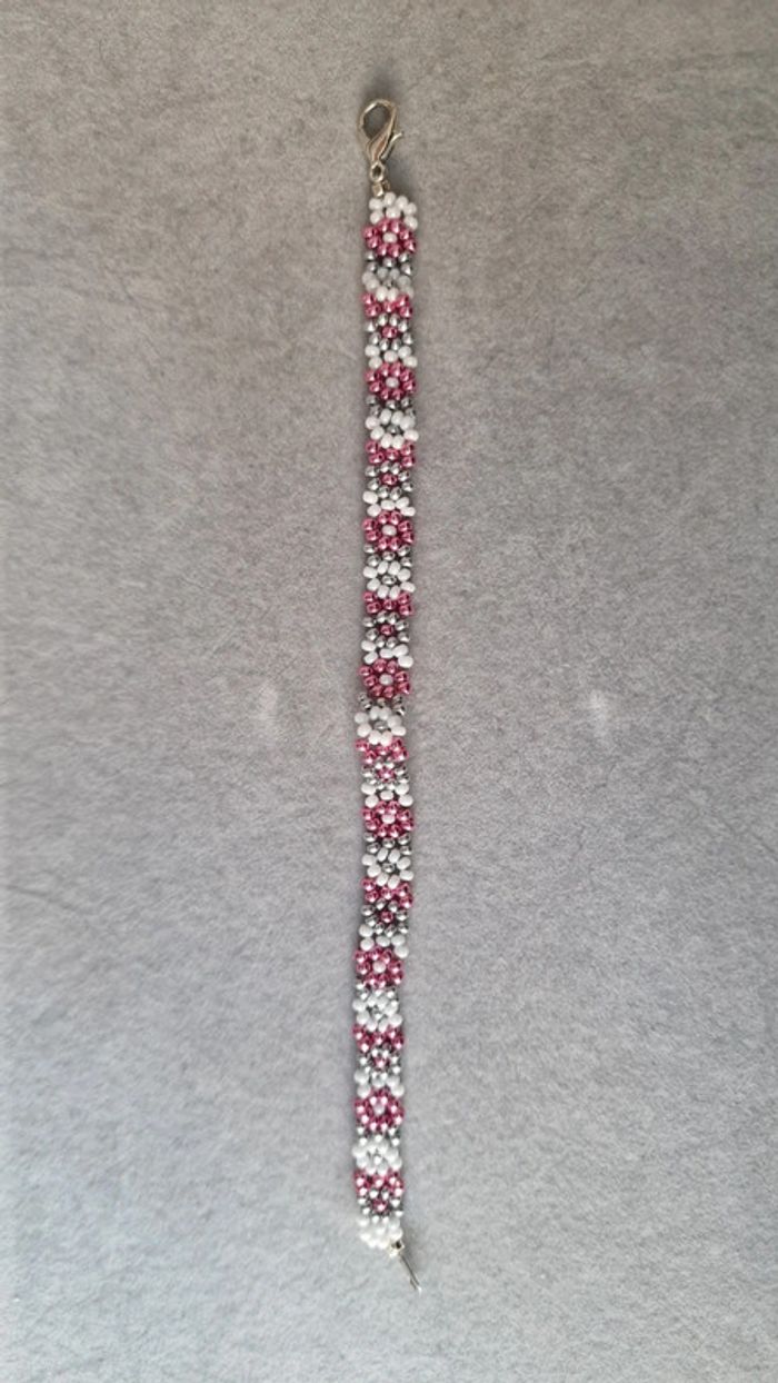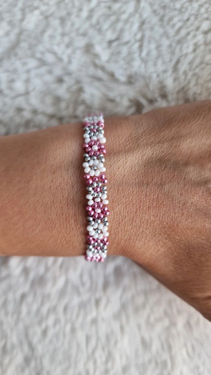 Bracelet en perles motif fleurs, couleurs rose, blanc nacré et argenté Marque Crystalia perles comme neuf Taille 17cm #summer #perles&co #braceletfemme #rose #vacances #perlesderocailles
