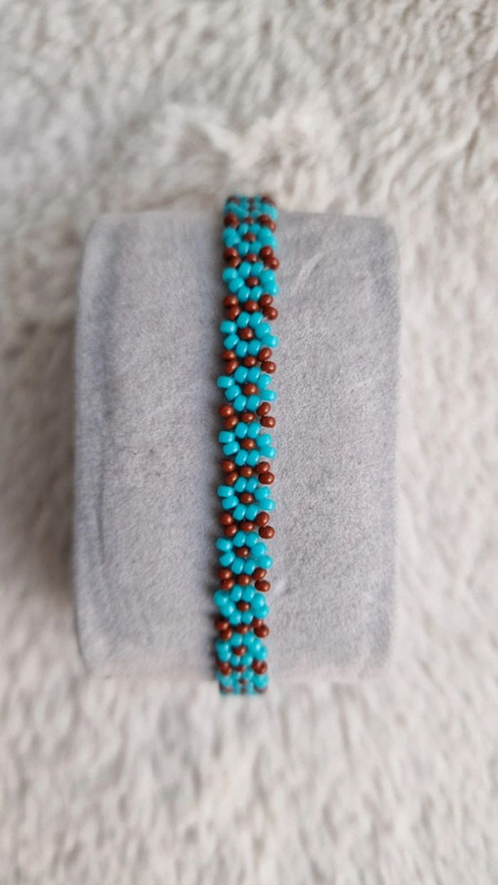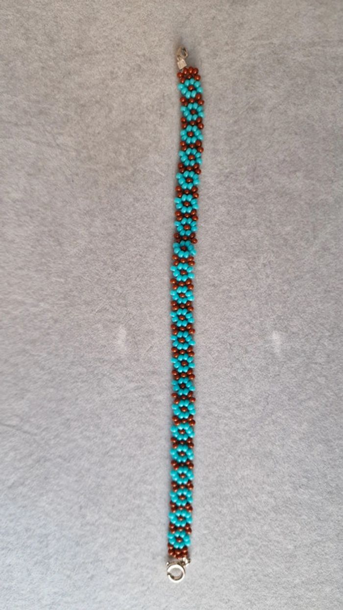Bracelet en perles motif fleurs, couleurs turquoise et marron Marque Crystalia perles comme neuf Taille 17cm #summer #perles&co #braceletfemme #marron #turquoise #vacances #perlesderocailles #monoï