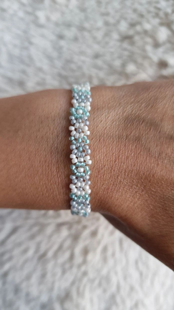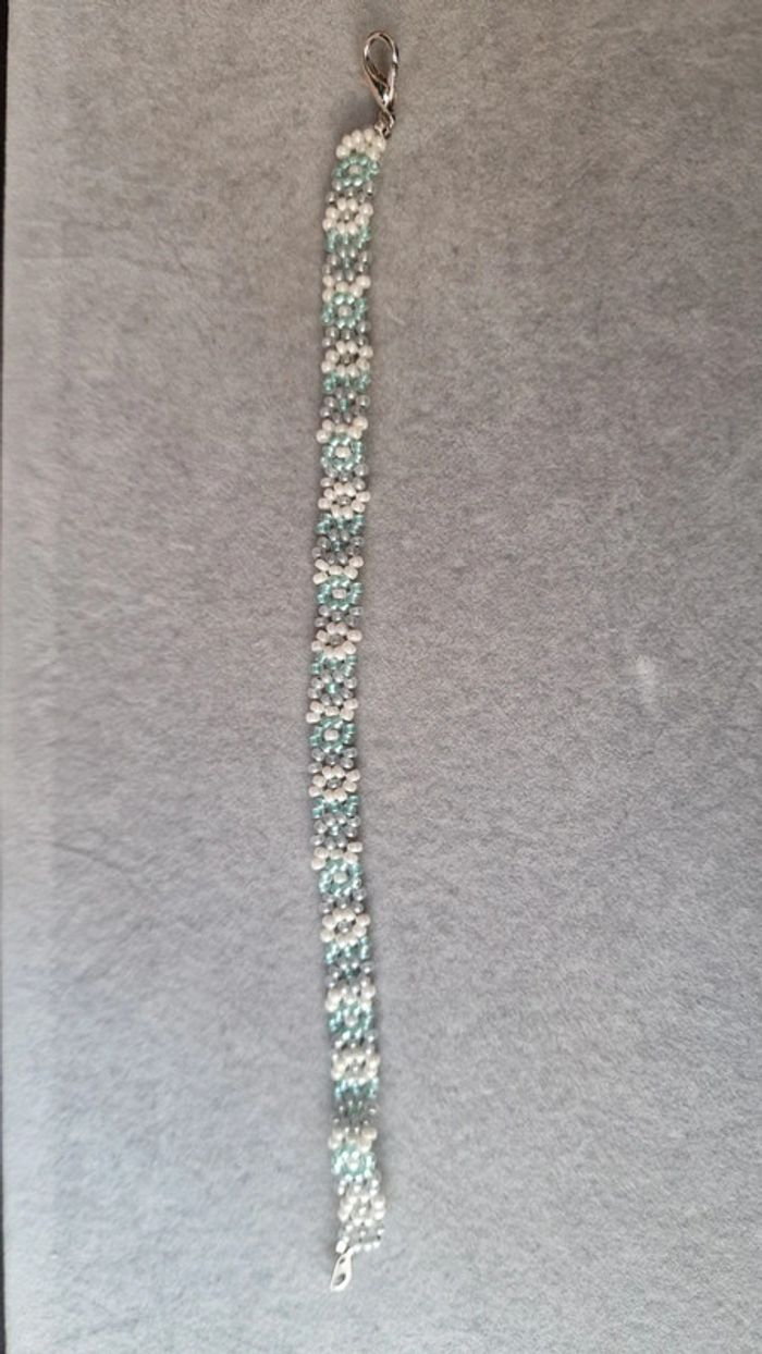 Bracelet en perles motif fleurs, couleurs vert d'eau transparent et blanc nacré Marque Crystalia perles comme neuf Taille 18cm #summer #perles&co #braceletfemme #vertdeau #bleu #vacances #perlesderocailles