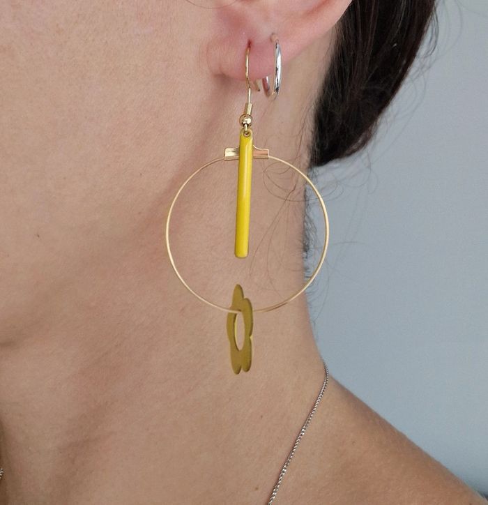 Boucle d'oreille créole doré finition breloque jaune en acier inoxydable Marque Crystalia Perles comme neuf Diamètre 3,5cm #perles&co #perlesatoutva #créoles #creolejaune #creoledoré #doré #bouclesdoreilles #vacances #fleurs #acierinoxydable