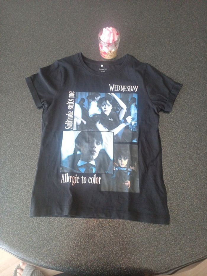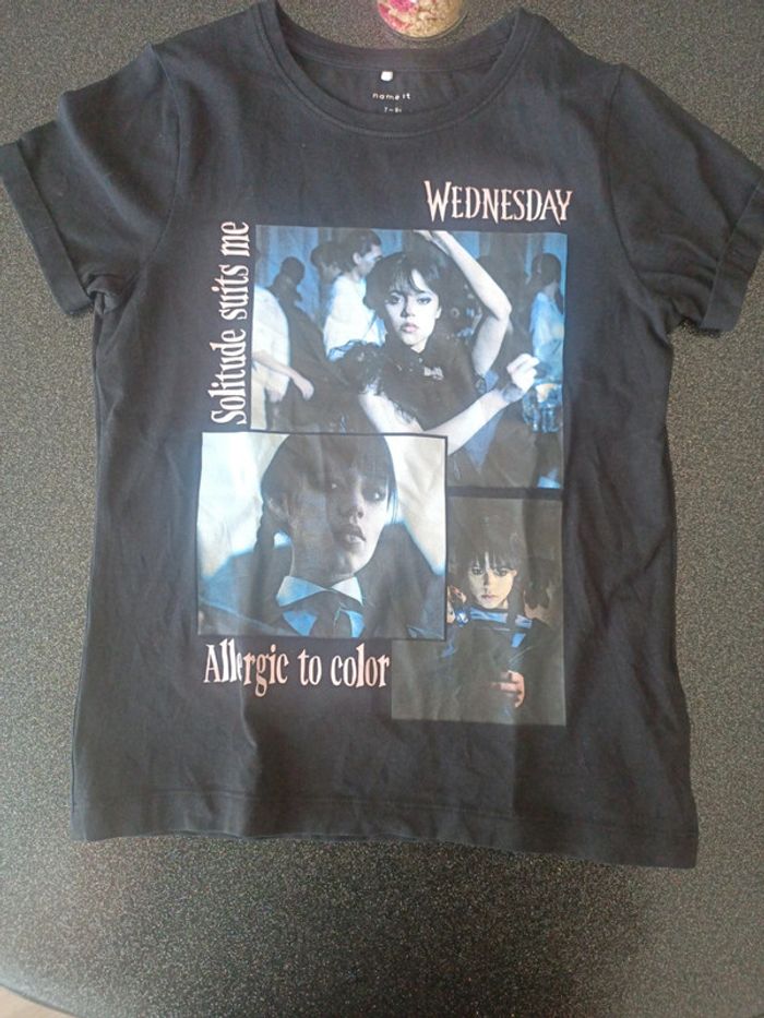 💗 Tshirt manches courtes 💗 🐑 Couleur noir🐑 ✨Taille7/8ans✨ 🩵 Parfait état porté 1fois🩵 💕 Marque Name it 💕 🍄Motif wednesday 🍄 @fille7/8ans.aziz0110