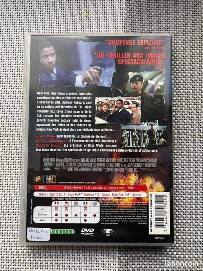 Vends DVD du film « Couvre-feu » avec Denzel Washington, Annette Bening et Bruce Willis. Le boîtier et le DVD sont en très bon état. Fonctionne parfaitement. Il pèse 106g. Idéal pour les amateurs de cinéma, fans des acteurs ou collectionneurs.