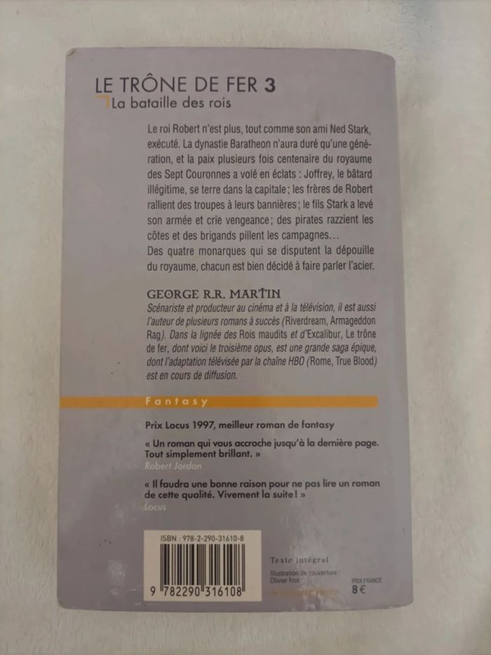 📚 Le Trône de Fer III : La Bataille des Rois – J.R.R. Martin État : Très bon état Description : Tome 3 du Trône de Fer, très bon état, couverture et pages soignées. Idéal pour compléter une collection ou découvrir la saga. 💨 Envoi rapide et soigné 📚 Réduction si achat de plusieurs livres 🔎 Retrouvez tous mes livres avec le hashtag #LivresDePeylhomalyejha #livre #fantasy #Martin #occasion #VintedBooks #LivresDePeylhomalyejha