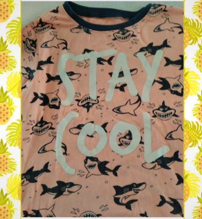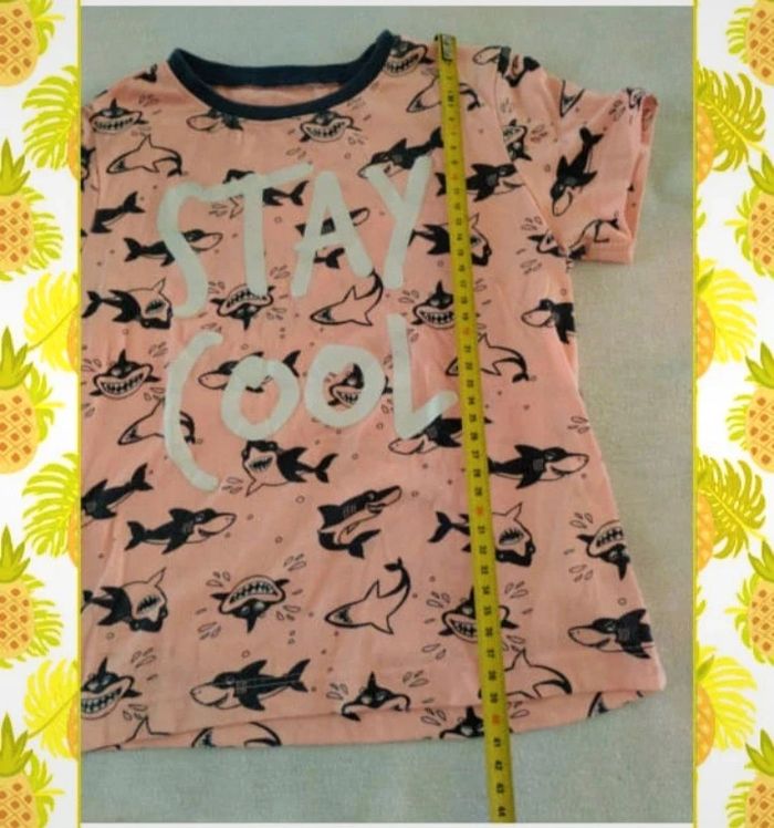 T shirt salon avec requins en motifs "Stay Cool" Taille notée : 5ans /107-113cm Marque : In Extenso Mensurations sur les dernières photos #5ans_laurence8777