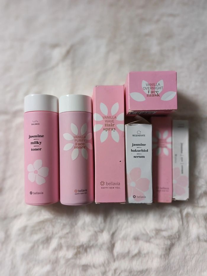 Lot de 7 produits Bellavia comprenant face toner, Milk toner, sérum au bakuchiol, masque visage, soin hydratant pour les yeux, soin pour les yeux au jasmin et spray pour les cheveux