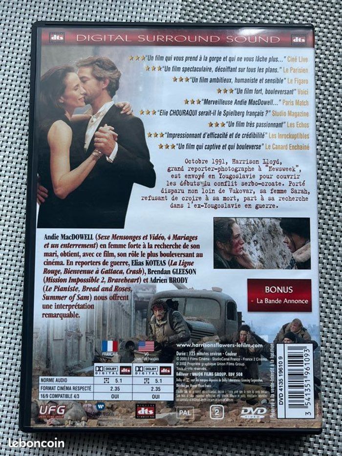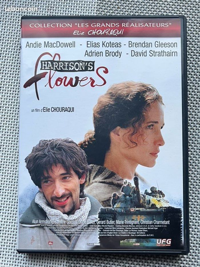 Vends DVD du film d’Elie Chouraqui « Harrison’s Flowers ». Le boîtier et le DVD sont en excellent état. Il pèse 99g. Idéal pour les amateurs de cinéma, fans des acteurs ou collectionneurs.
