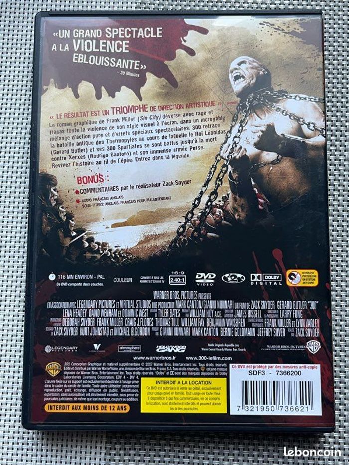 Vends DVD du film « 300 » avec Gérard Butler. Le boîtier et le DVD sont en excellent état. Fonctionne parfaitement. Il pèse 85g. Idéal pour les amateurs de cinéma, fans de l’acteur ou collectionneurs.