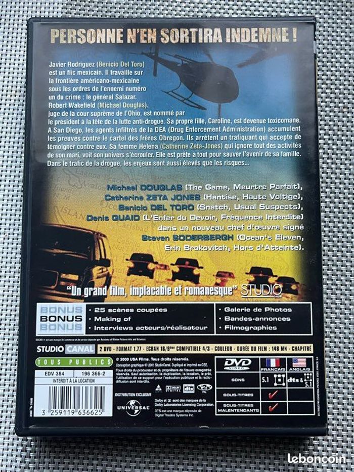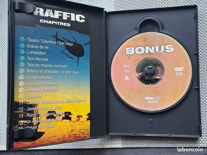 Vends double DVD du film « Traffic », édition collector, avec Michael Douglas, Don Cheadle, Benicio Del Toro, Dennis Quaid et Catherine Zeta-Jones. Le boîtier et les DVD sont en très bon état. Il pèse 164g. Idéal pour les amateurs de cinéma, fans des acteurs ou collectionneurs.