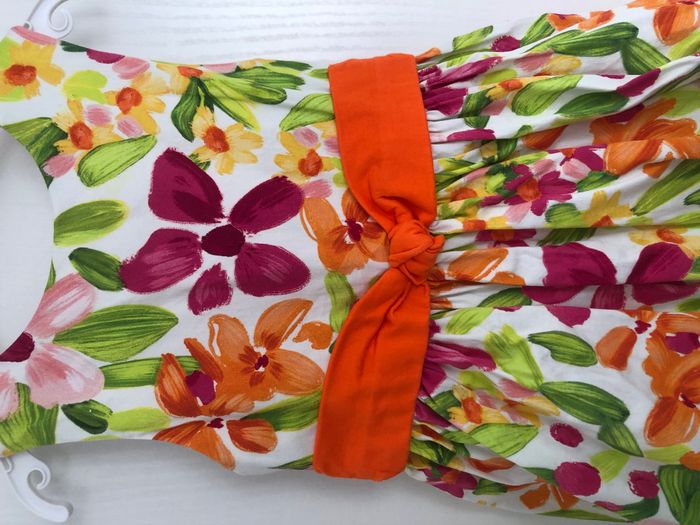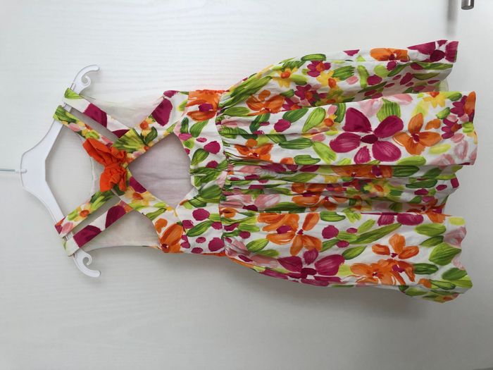 Magnifique robe sans manche pour fille. Col rond. Ouverture arrière avec fermeture à glissière invisible et deux boutons pression. Éléments décoratifs: nœud, ceinture simulée à la taille. Design imprimé floral. Marque Mayoral Taille 7 ans, 122 cm