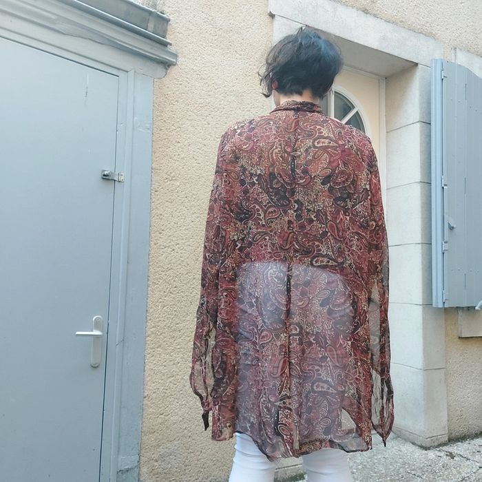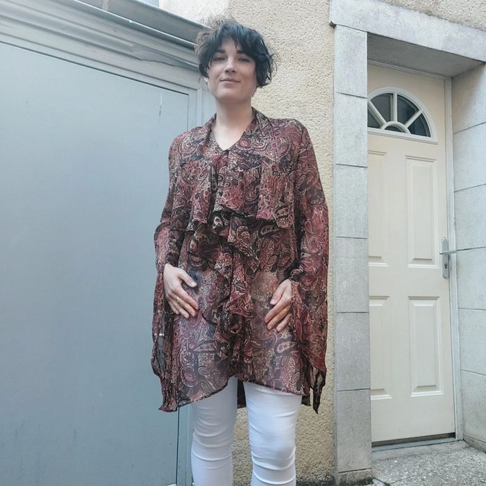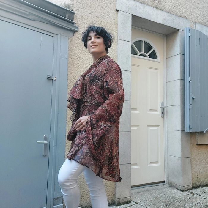 Pas d'étiquette intérieure Se ferme avec crochets et tout en haut, petits boutons Va d'un 36 à un 42 je pense. Attention, manches assez longues