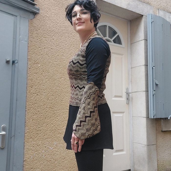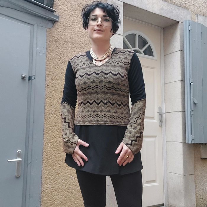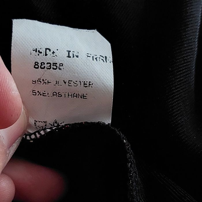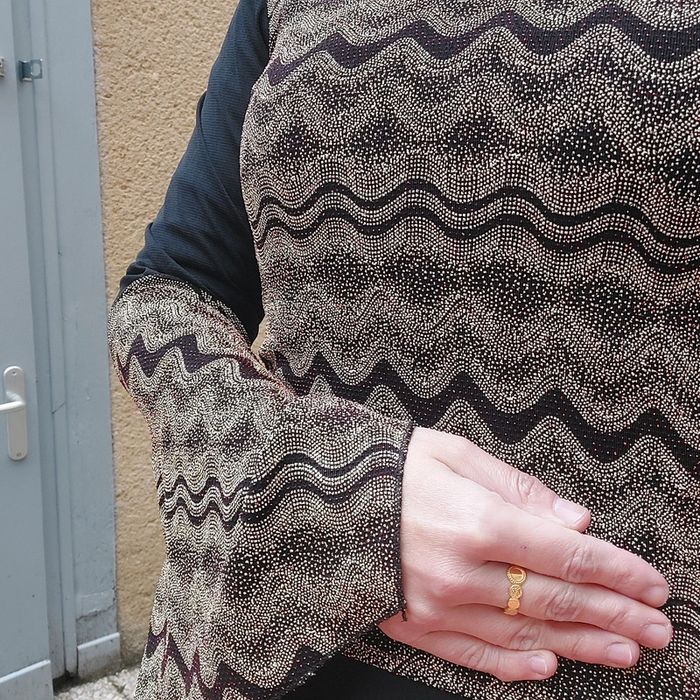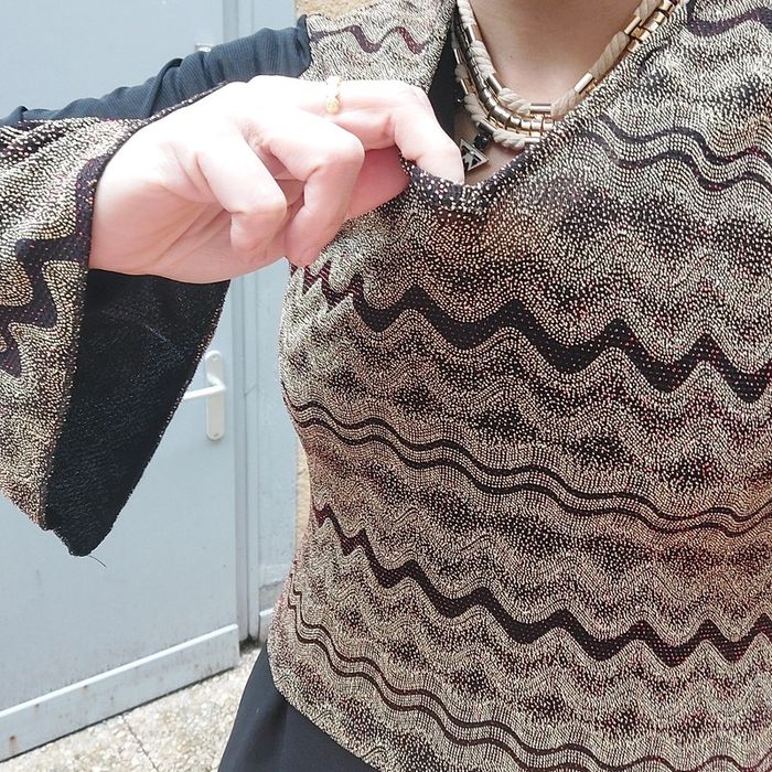 Manches évasées Matière elasthane un peu lurex, avec légers reflets brillants rouges sur la partie beige Le haut des manches est en voile, ici on ne voit pas la transparence car j'ai mis par dessus une combinaison Étiquette de taille délavée Je dirais pour 38 40
