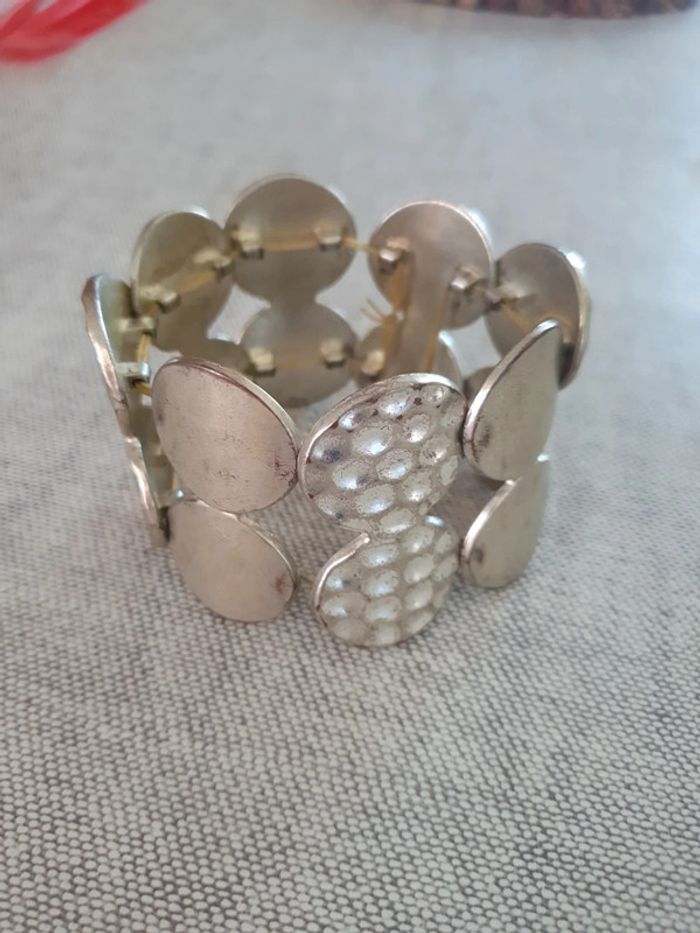 Bracelet large argenté Bracelet fantaisie coloris argenté. Poignet élastique. Largeur 5 cm. Nombreux bijoux dans ma vitrine.