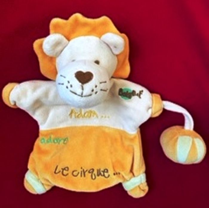 MARIONNETTE LION EN VELOURS ORANGE ET BEIGE SUR LE DEVANT DES INSCRIPTIONS SONT BRODEES : ADAM...adore le cirque UNE BALLE AVEC PATTES EST ATTACHEE A UN COTE ETAT PARFAIT !