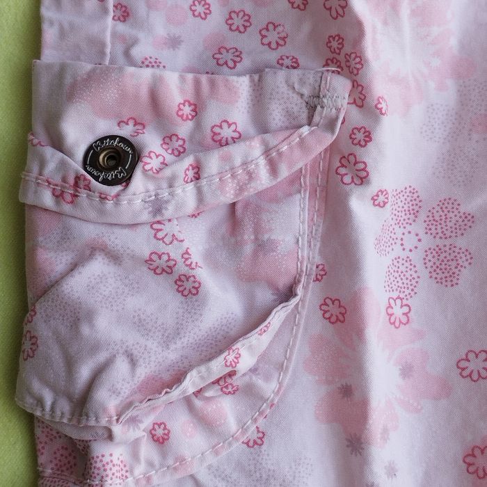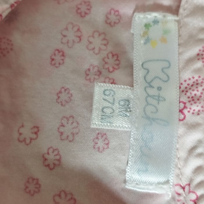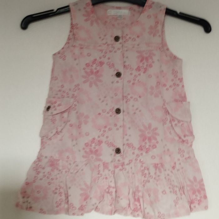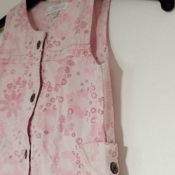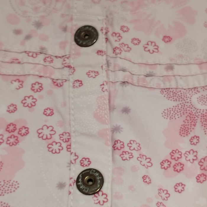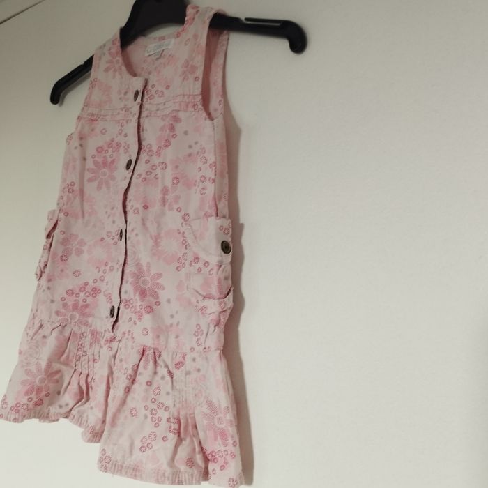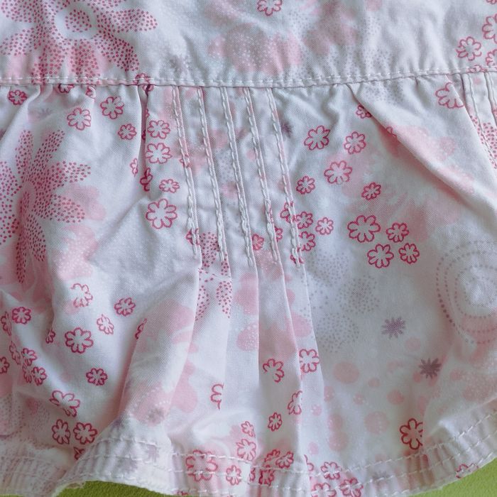 Robe pour bébé de 6 mois de chez Kitchoun, 2 petites poches avant, fermeture avant par boutons pressions, motifs fleurs rose pâle et fuchsia sur fond blanc. Comme neuve !