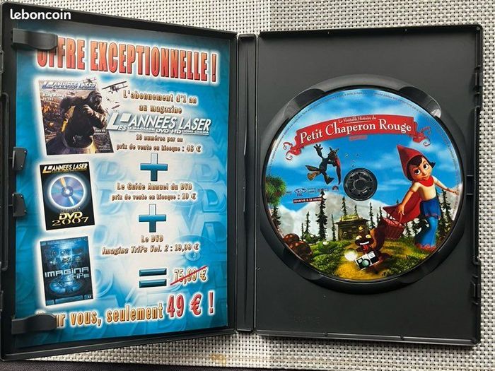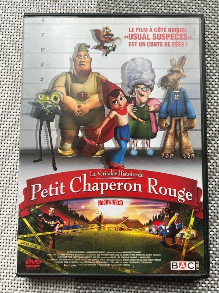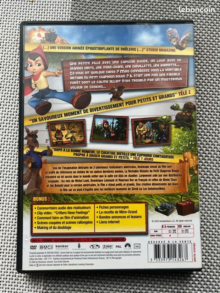 Vends DVD du film d’animation « la véritable histoire du Petit Chaperon Rouge ». Le boîtier présente de légères marques mais bon état général. Le DVD présente de légères traces mais fonctionne parfaitement. Il pèse 101g. Idéal pour les amateurs de cinéma, famille ou collectionneurs.