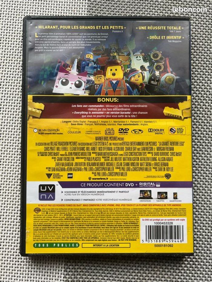 Vends DVD « La grande aventure LEGO ». Le boîtier est abîmé sur la face avant. Les DVD présentent de légères traces mais fonctionnent parfaitement. Il pèse 78g. Idéal pour les amateurs de cinéma, la famille ou collectionneurs.