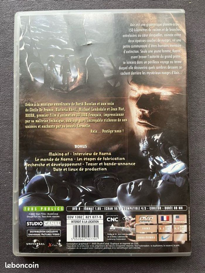 Vends DVD du film d’animation « Kaena, la prophétie ». Le boîtier est en bon état. Une légère marque au dos. Le DVD est en très bon état général. Fonctionne parfaitement. Il pèse 83g. Idéal pour les amateurs de cinéma, collectionneurs ou amateurs de films d’animation.