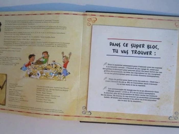 Avec ses 15 chapitres très bien illustrés et très animés, cet ouvrage est la « bible » des jeux et des activités à faire pour les petits garçons entre 6 et 9 ans lors de leur temps libre (mercredi, vacances, week-end...). Grâce à ses nombreuses animations (enveloppes, pochettes, cartes à découper), cet ouvrage va permettre aux petits garçons d’apprendre à : - dessiner des mangas ; - respecter les règles du football ; - faire les farces et les blagues les plus drôles ; - réaliser un dessin animé ; - fabriquer un superbe château fort en carton... Éditeur ‏ : ‎ LAROUSSE 32 pages Âge de lecture ‏ : ‎ Dès 8 ans Dimensions ‏ : ‎ 26 x 2.3 x 26.5 cm Livre en très bon état