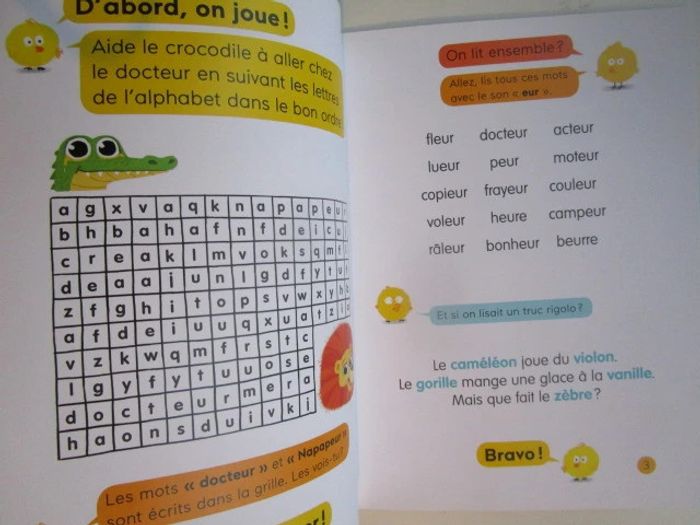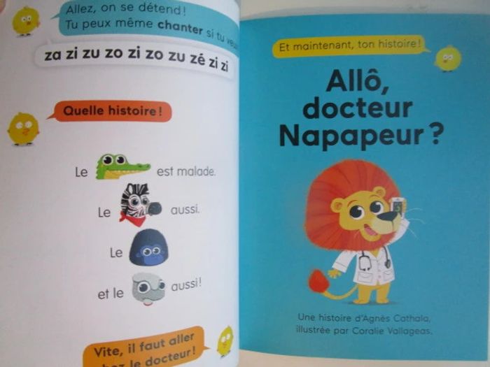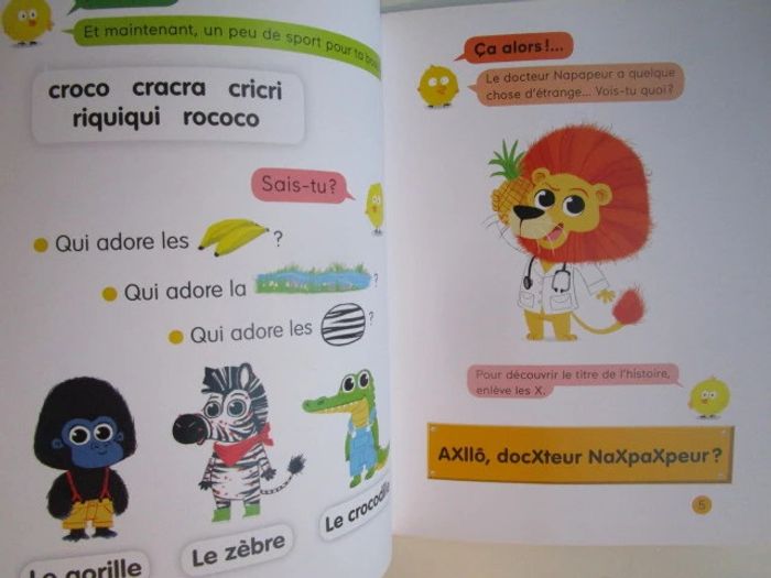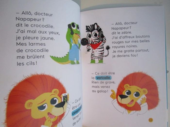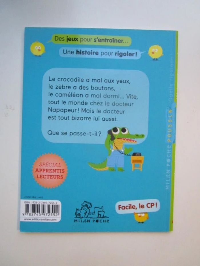 Dès la grande section de Maternelle, Milan Poche Poussin accompagne les apprentis lecteurs avec une formule inédite de livre en 3 parties : 1. L'échauffement, avec des jeux pour prendre confiance - 2. Le récit, avec une histoire simple à lire - 3. La récréation, avec une comptine pour se détendre. Une collection conçue avec un conseiller pédagogique pour entrer dans la lecture en douceur. Le crocodile a mal aux yeux, le zèbre a des boutons, le camaléon a mal dormi... Vite, tout le monde chez le docteur Napapeur ! Mais le docteur est tout bizarre lui aussi. Que se passe-t-il ? Éditeur ‏ : ‎ Editions Milan 24 pages Âge de lecture ‏ : ‎ 5 - 7 ans Dimensions ‏ : ‎ 14 x 0.5 x 19 cm Livre en très bon état Je vends d'autres livres premières lectures #phil_peg_premièreslectures #cp #apprentissagelecture #premièreslectures #milanpoussin #lirecestfacile