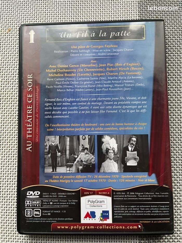 Vends DVD de la pièce de théâtre « un fil à la patte », de la collection « Au théâtre ce soir ». Le boîtier et le DVD sont en très bon état. Fonctionne parfaitement. Il pèse 91g. Idéal pour les amateurs de théâtre, collectionneurs.