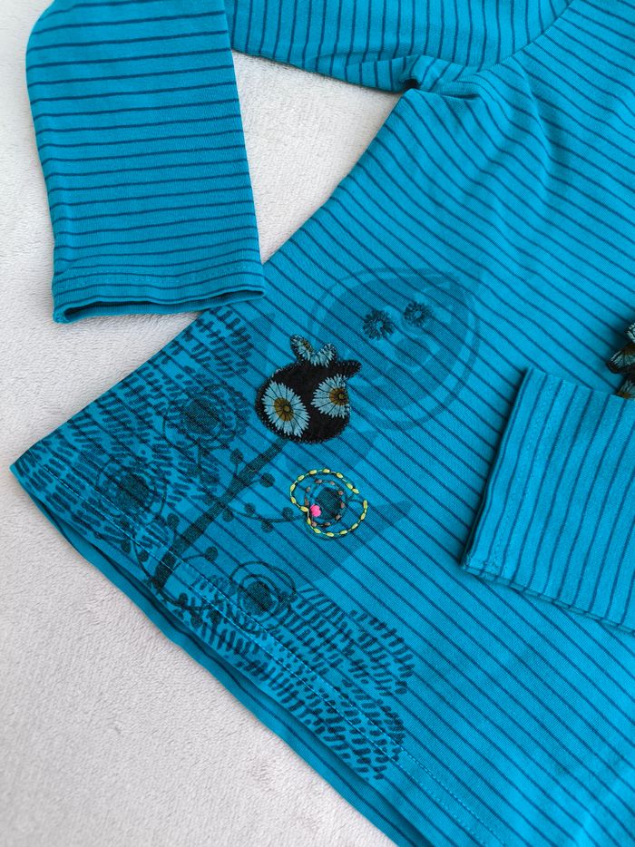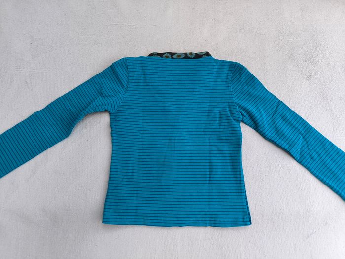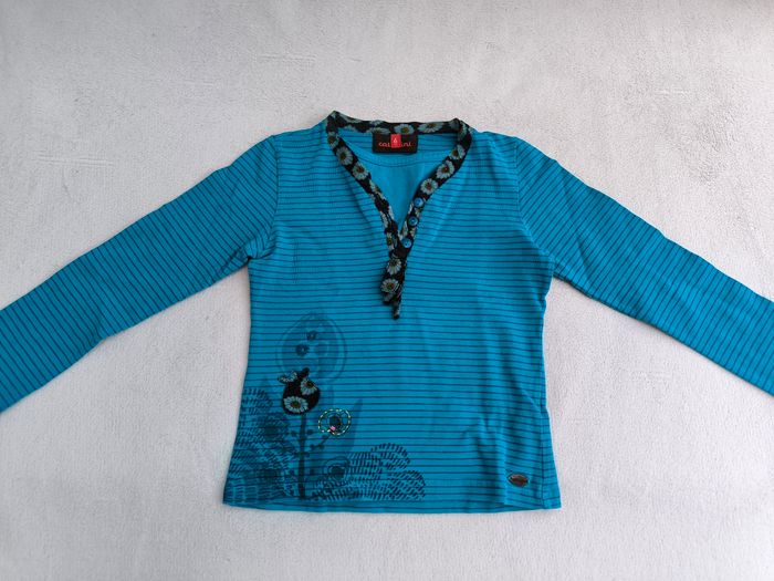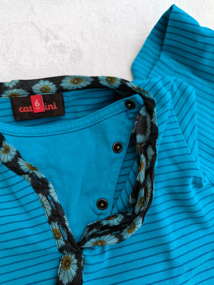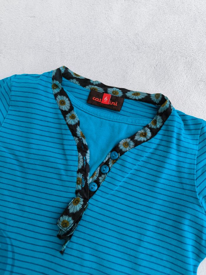 T-shirt à manches longues Marque Catimini Taille 6 ans, 116 cm • Coloris bleu, marine, gris • Rayures horizontales, imprimés et broderies fleurs • Boutons et pressions au col • Coton fin, stretch En très bon état #evelyne_filles_6ans #evelyne_filles