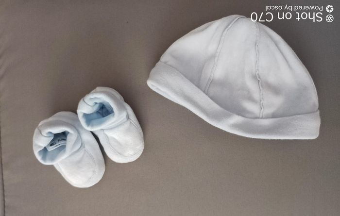 Ensemble bonnet et chausson naissance Velours ras bleu clair Peu porté Naissance Tout le 0 mois ici 👇 #angiolinolino_0mois