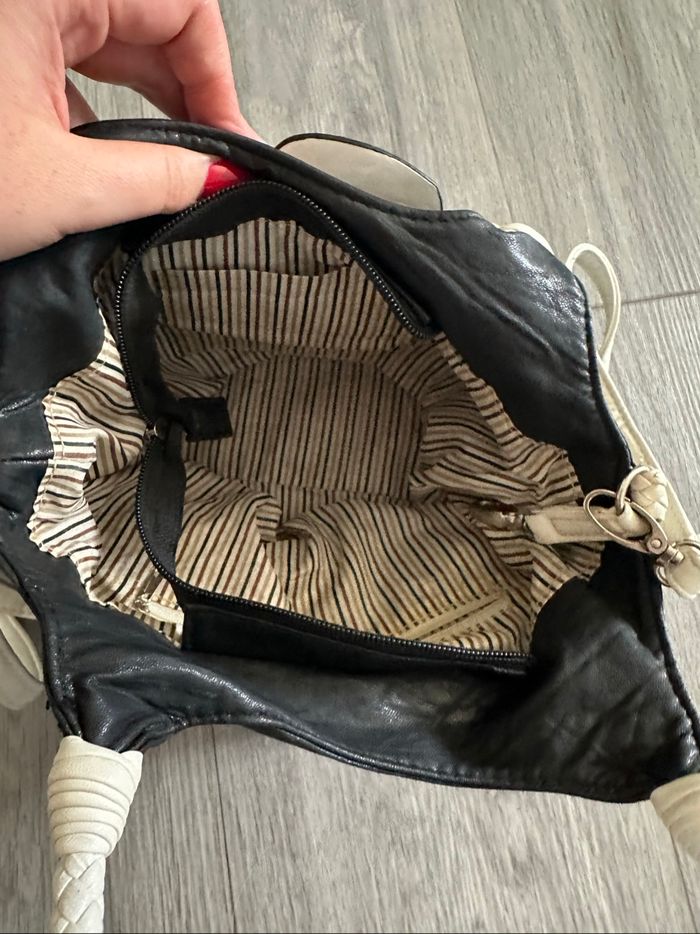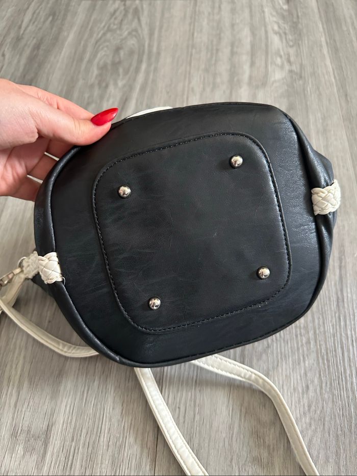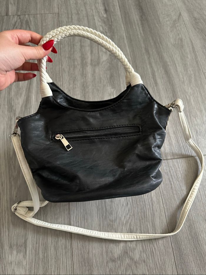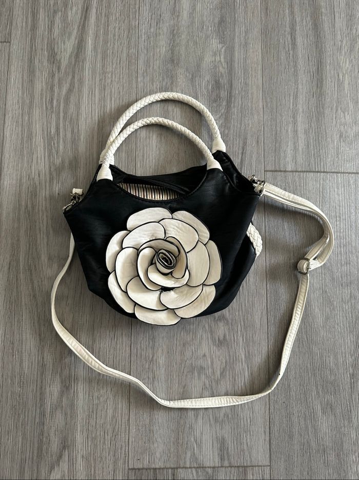 Sac à main - Excellent état - Noir et blanc - Fleur en relief - Doublure intérieure en tissus - 2 anses - Une bandoulière amovible Dimensions: - 18cm de haut - 18cm de large - 18cm de profondeur