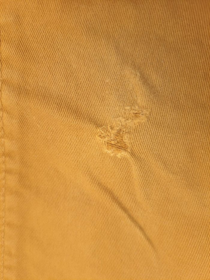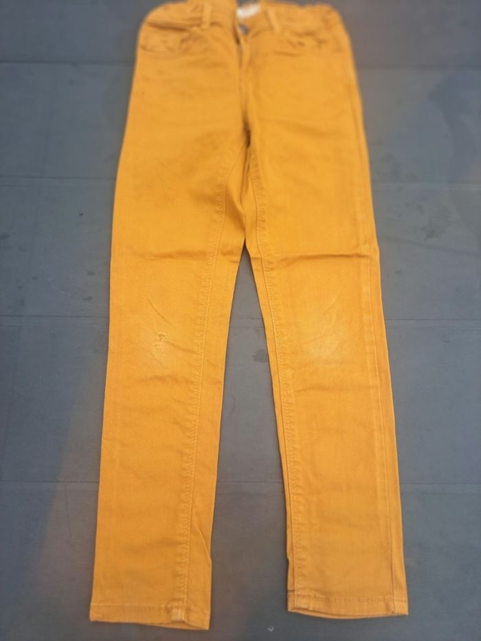 Porté. Skinny. Ferme avec 1 bouton pression et une fermeture. Réglable à la taille. 3 poches devant et 2 poches plaquées derrière. Stretch. Pas de tâches. Légères décolorations aux genoux. Petit trou sur le genou droit.