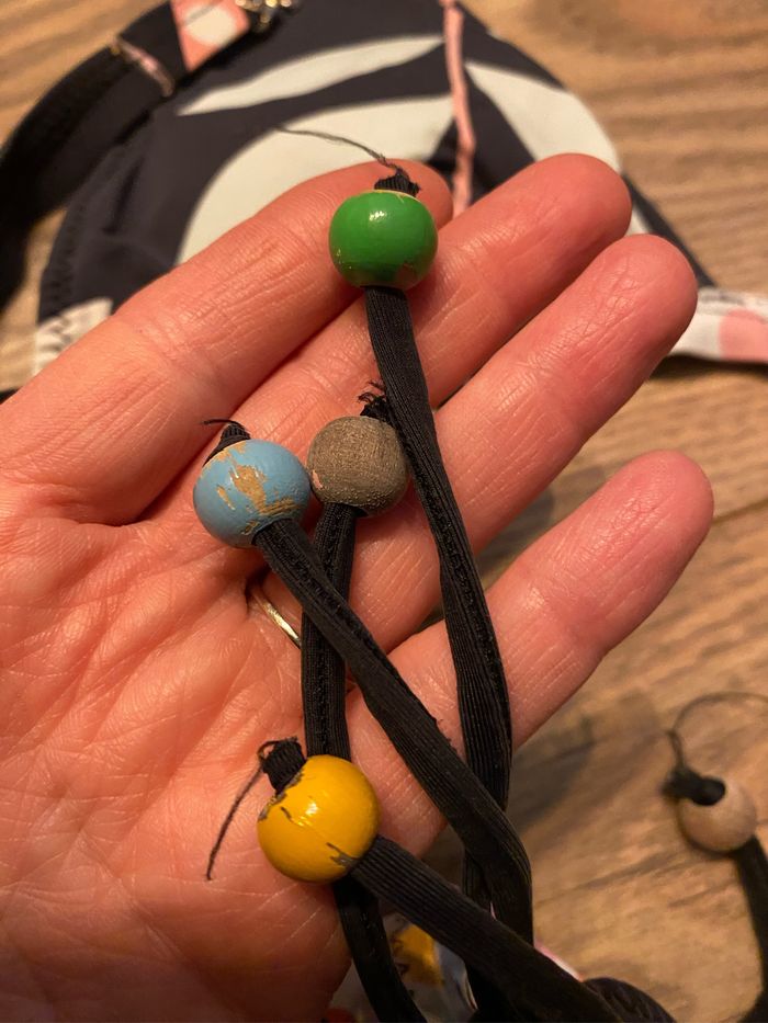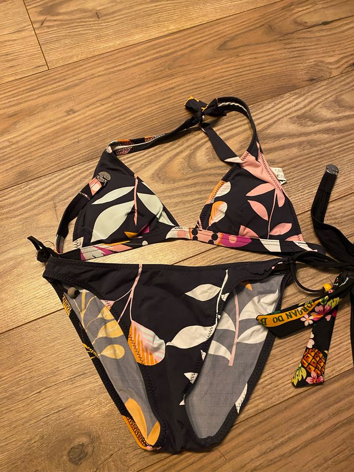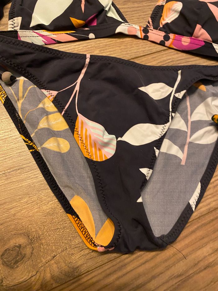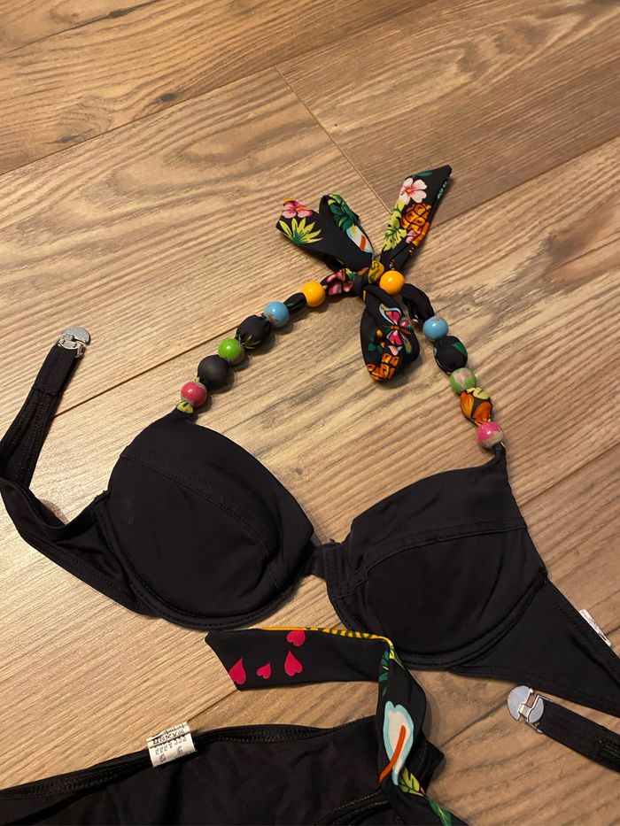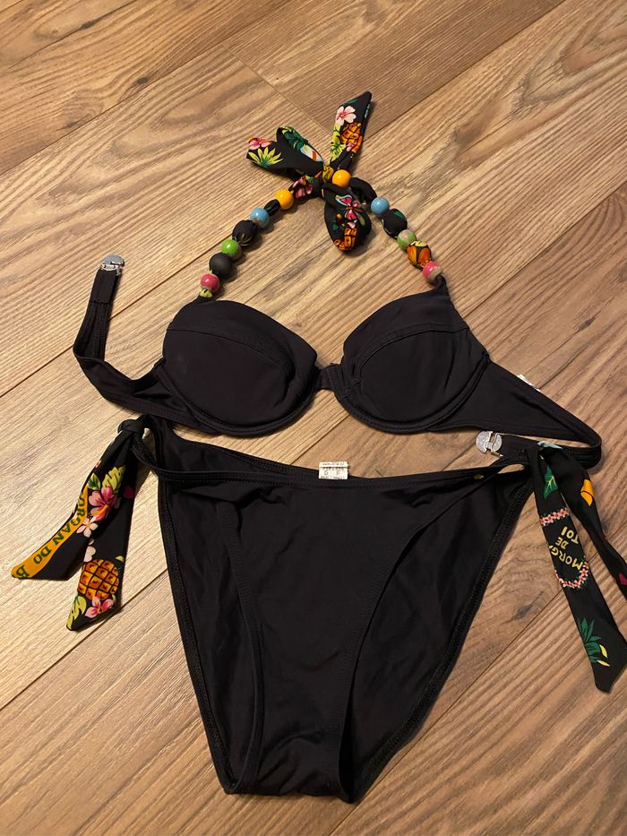 Lot 2 maillots de bain 2 pièces MORGAN T36/38 - 1 maillot de bain T36 noir à motifs fleuris, en très bon état juste les petites perles en bois sur la culotte ont perdu un peu de couleurs (voir photos) - 1 maillot de bain T38 noir avec perles en bois colorés. Il est noté T38 mais attention il taille petit et équivaut à un T36. Il est aussi en très bon état mais pareil que le premier, les perles sont en bois et les couleurs se sont délavées (voir photos).