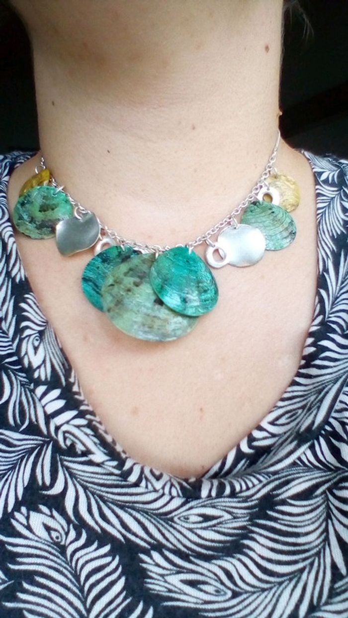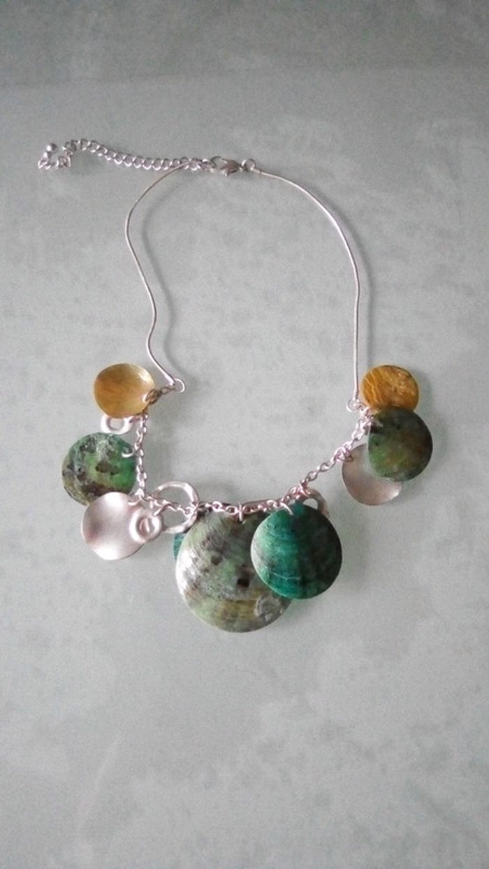 Très joli collier coquillage dans les tons vert.