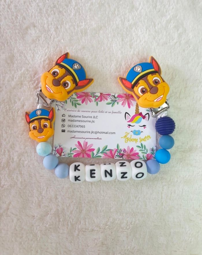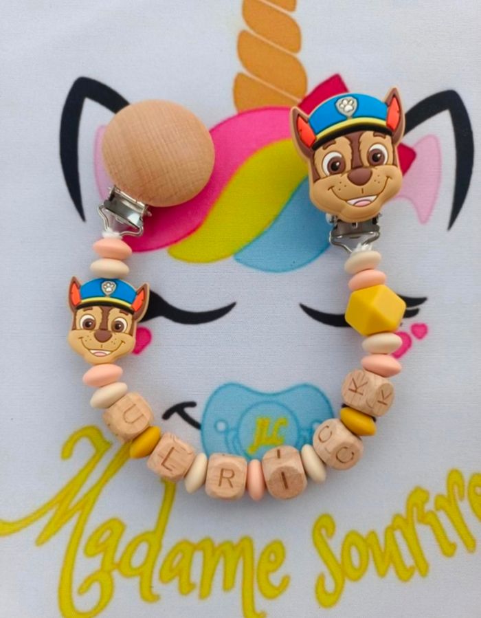 Une Attache doudou Pat patrouille pour ne plus perdre le doudou avec deux clips pour accrocher aux tissus sans les abîmer, un pour le vêtement, l'autre au doudou. Respect des normes CE, composée de perles silicone alimentaire et/ou bois naturel. 100% personnalisable, énormément de choix de clips, perles, etc… Envoyez-moi un message afin de créer main dans la main votre accessoire idéal. Une photo du prototype de celui-ci vous est envoyé pour validation avant envoi.