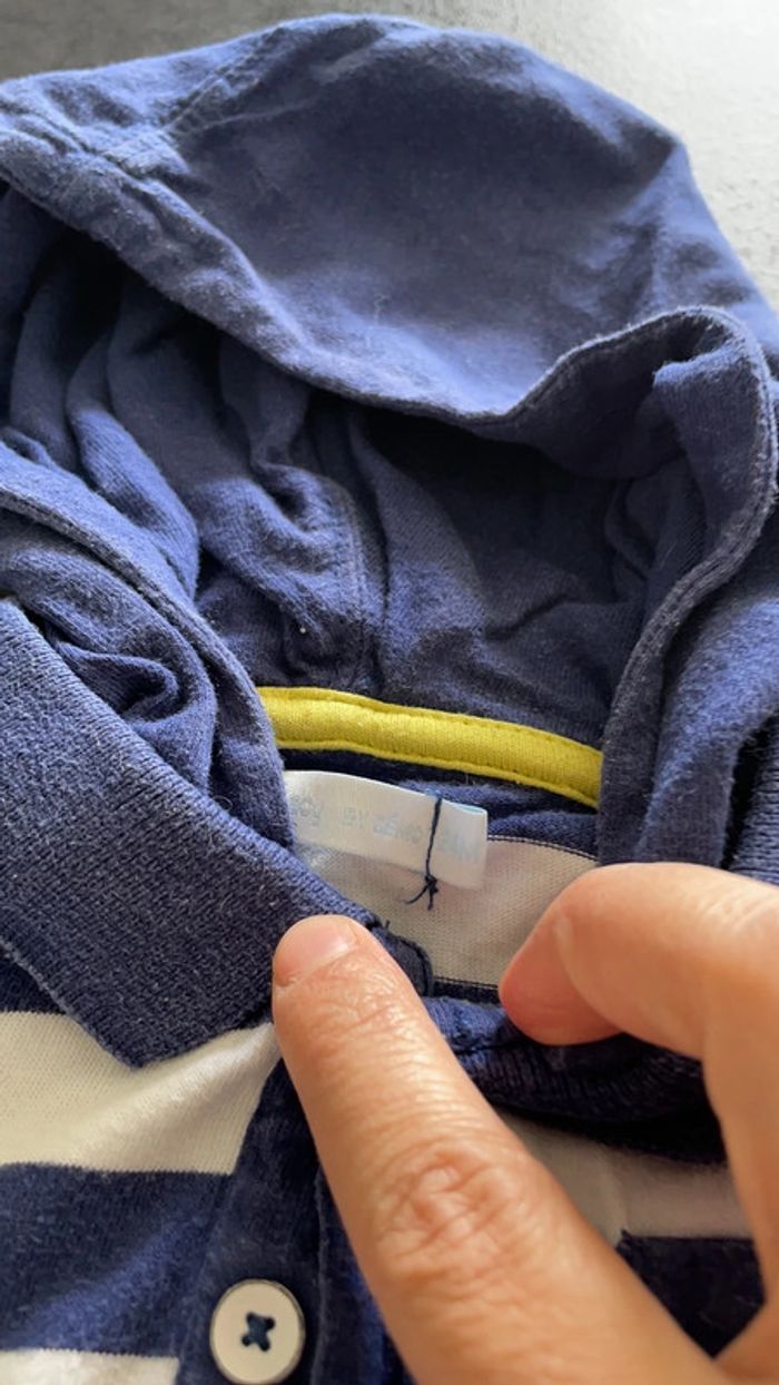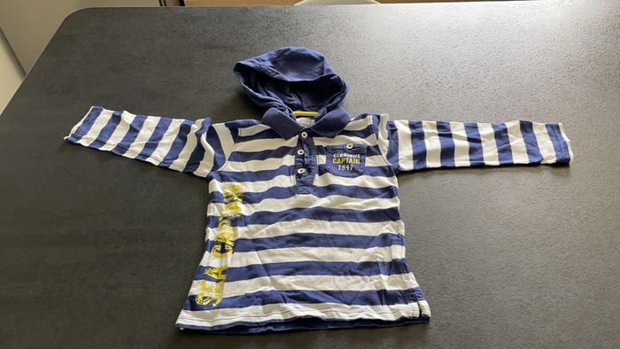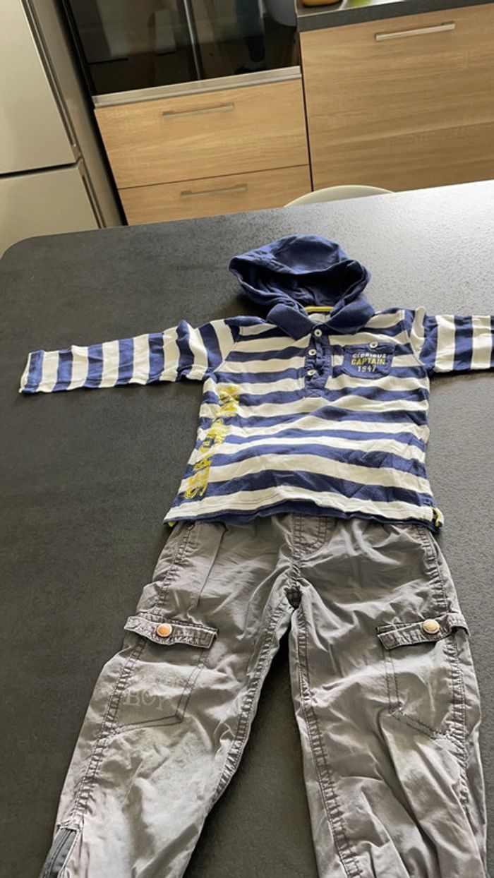 24 mois • Tee-shirt à capuche, rayé bleu et blanc : Gémo • Pantalon élastique, gris, bon état : Gémo Retrouvez les vêtements de mon fils en 24 mois : #vetements24mois_marg0106