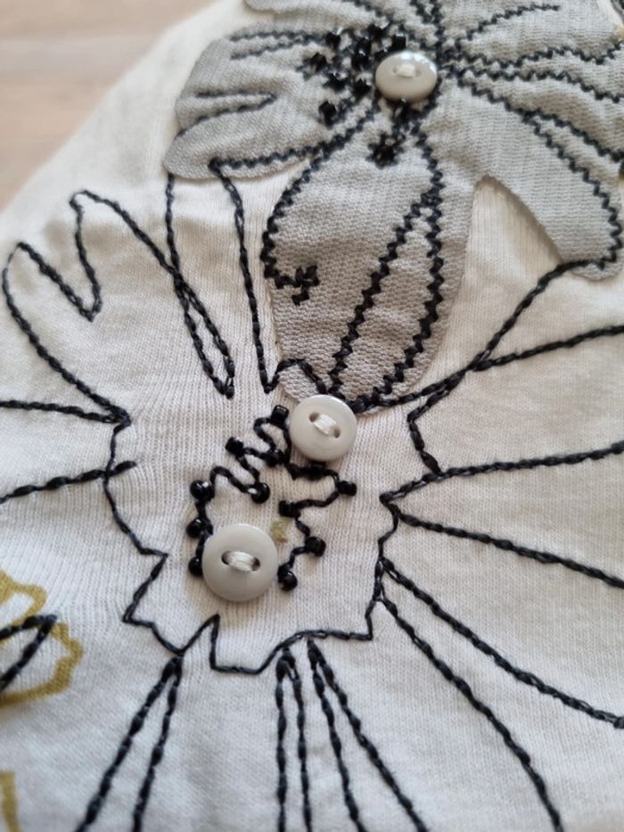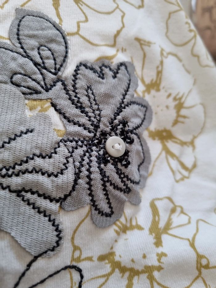 Tee-shirt kiabi 38 40, coton. motif floral gris cousus avec petits boutons gris et perles noires. État impeccable Mes réductions sont activées pour les lots 💐