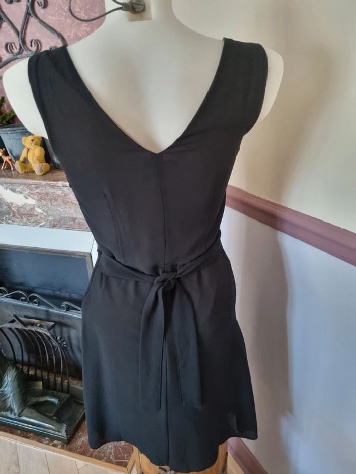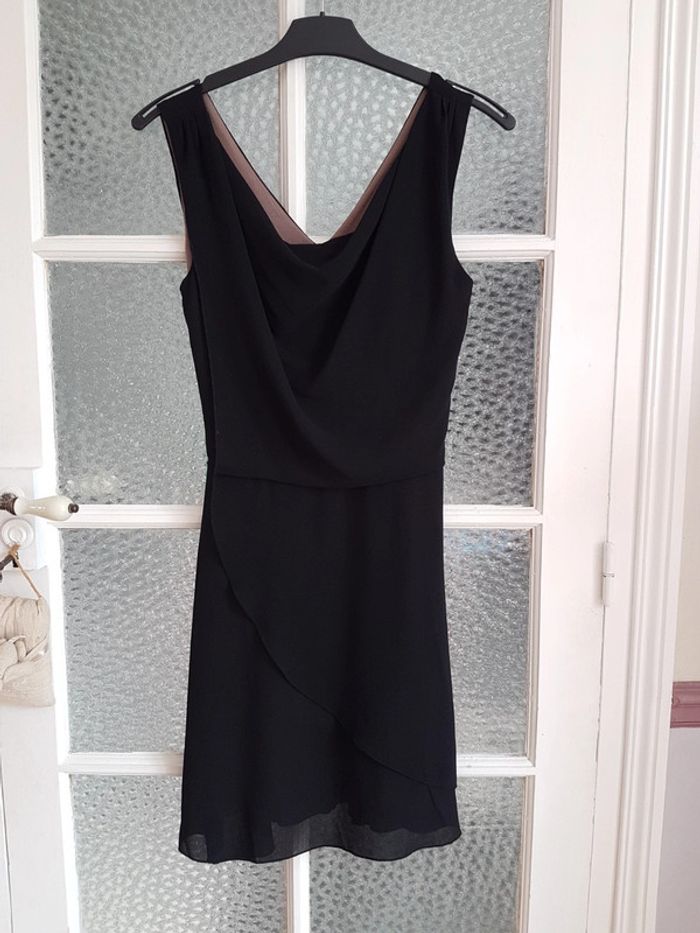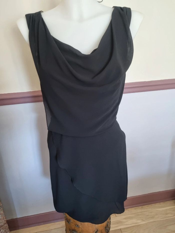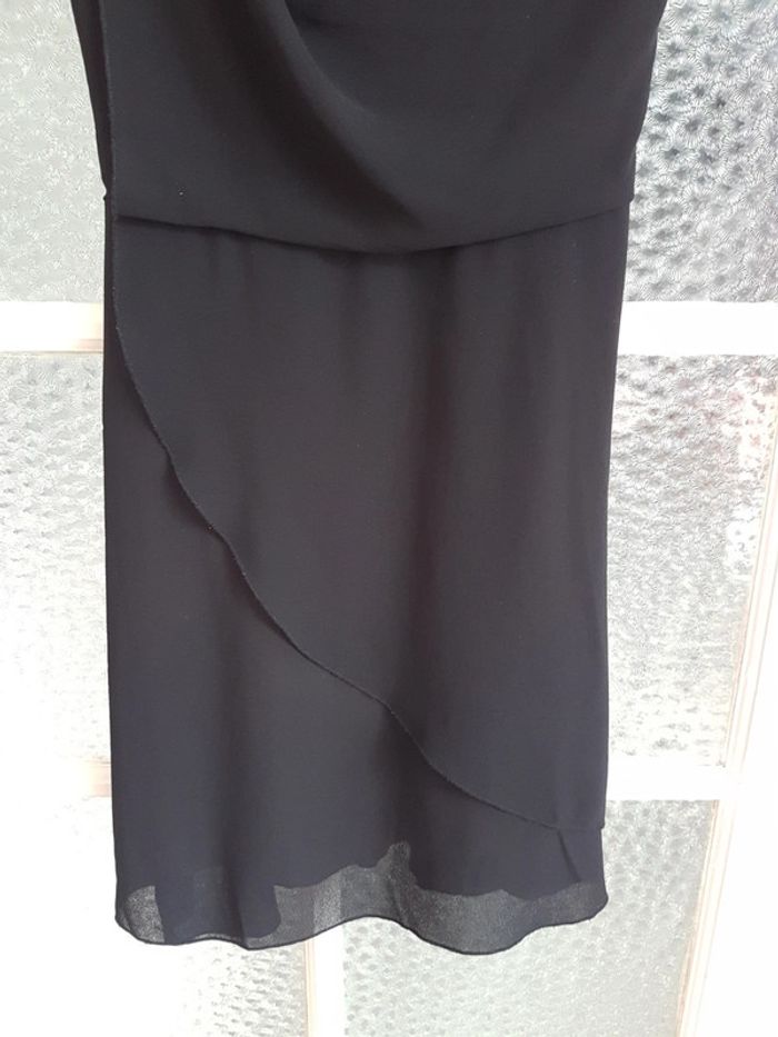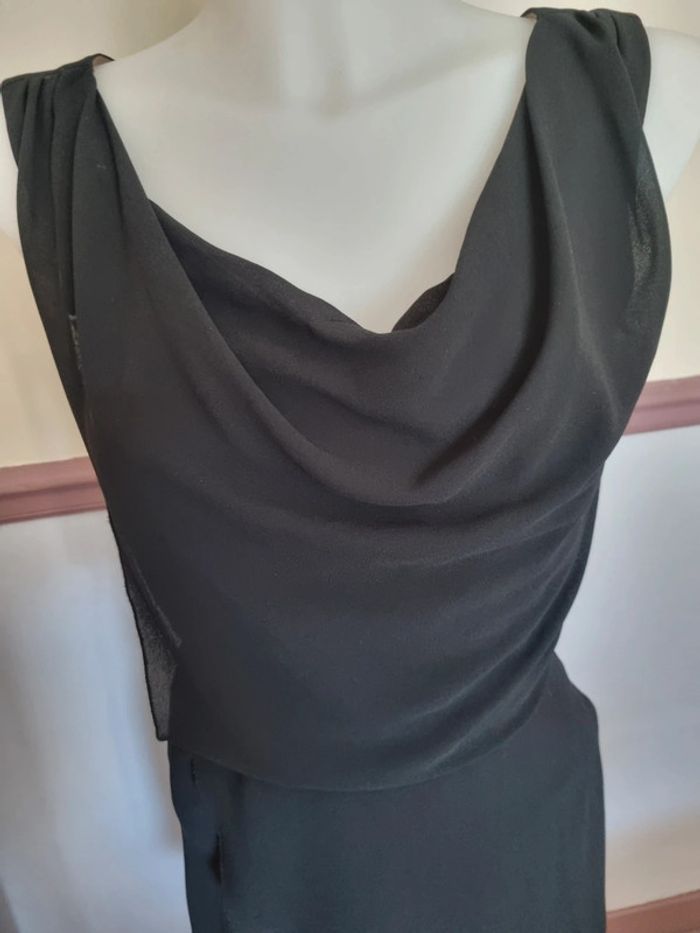 Robe noir cache cache 34 36 doublée viscose, fermeture sur le côté, très jolie tenue, agréable à porter, entièrement doublée, superposition de voile poitrine et col ample. Taille marquée par une ceinture à nouer derrière. Empiecement voile sur la jupe.