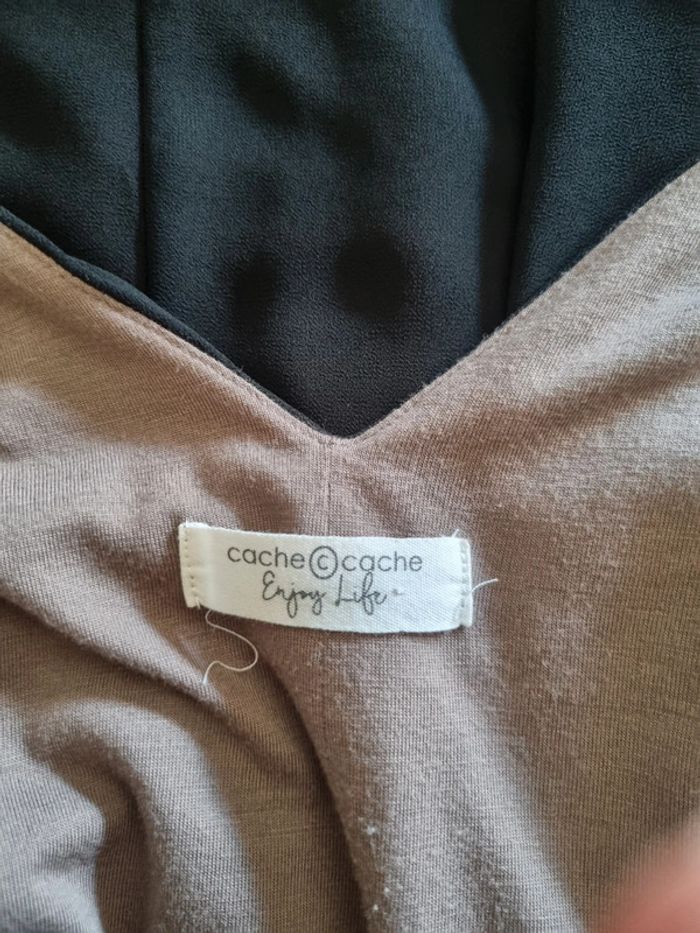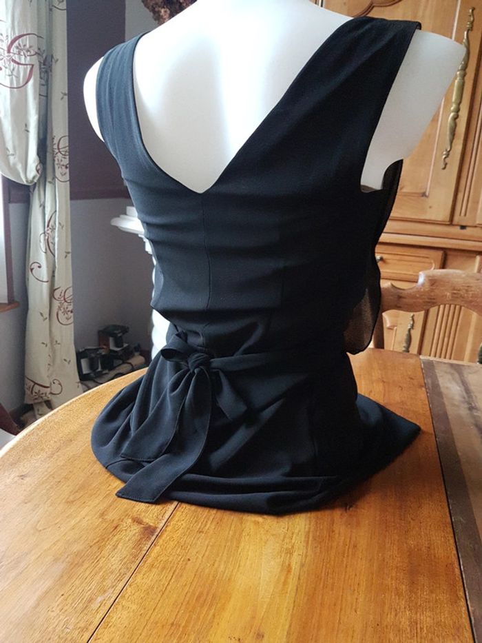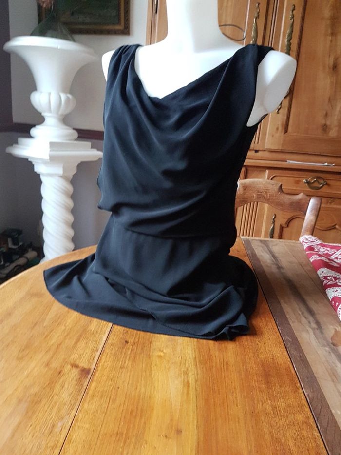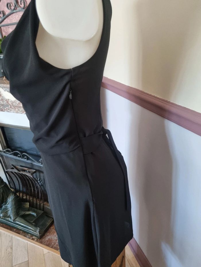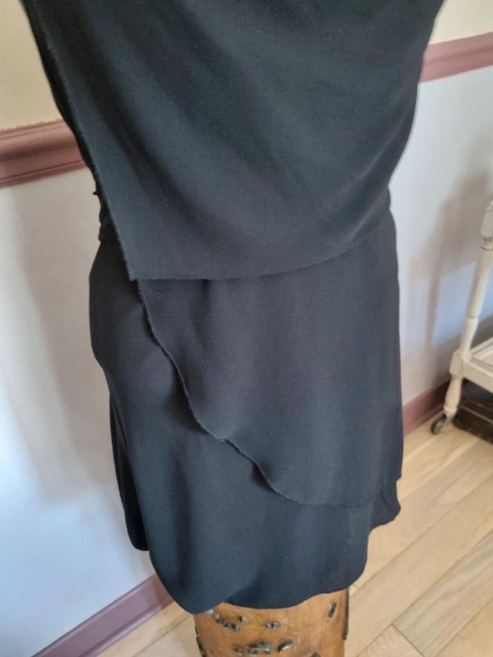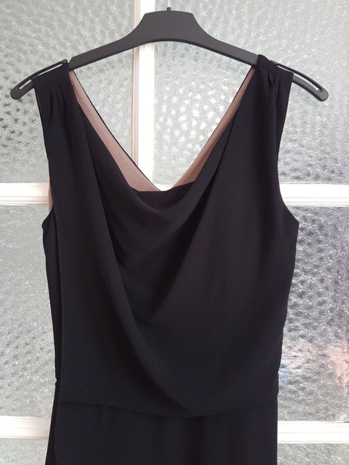 Robe noir cache cache 34 36 doublée viscose, fermeture sur le côté, très jolie tenue, agréable à porter, entièrement doublée, superposition de voile poitrine et col ample. Taille marquée par une ceinture à nouer derrière. Empiecement voile sur la jupe.