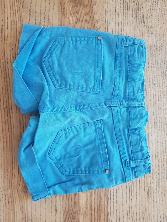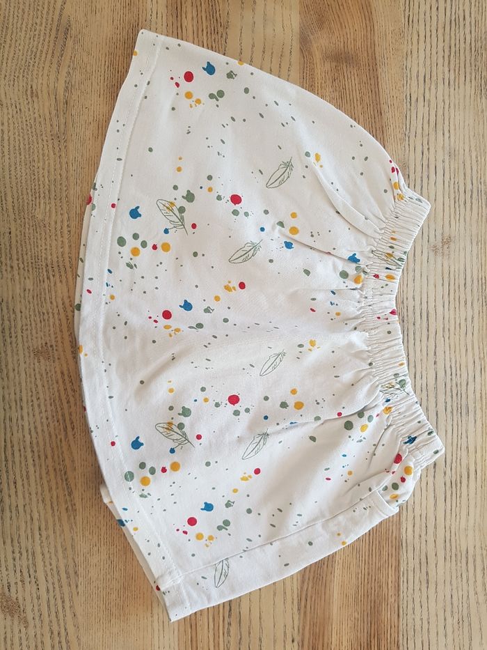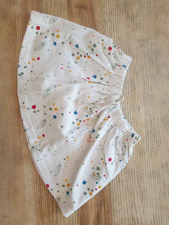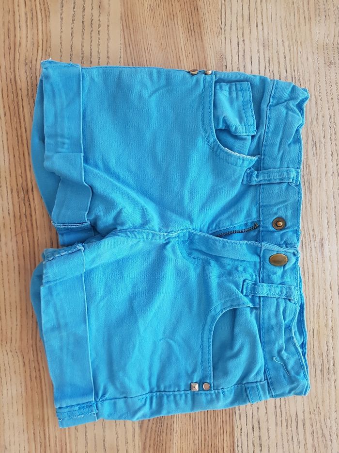 Un short bleu en jean, bouton pression + taille réglable grâce à des élastiques. Une jupe blanche avec détails colorés. Marque U pour le short. Marque Eldys pour la jupe. En très bon état. Taille 5 ans.