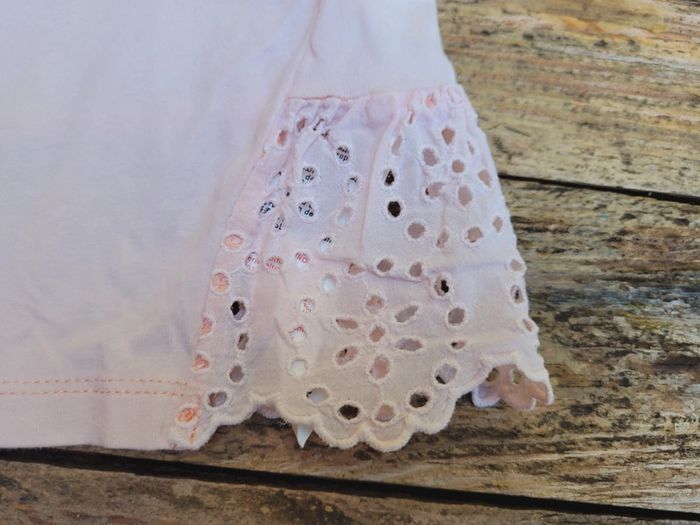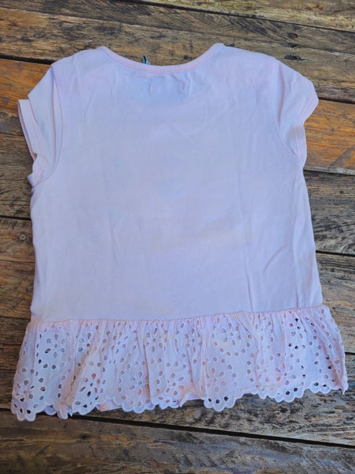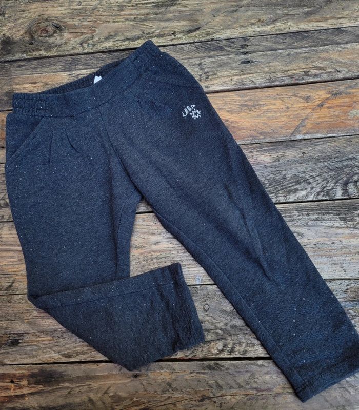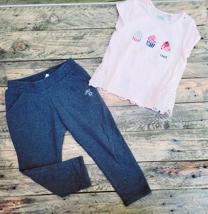 Superbe ensemble de la marque IKKS, composé d'un pantalon jogging gris anthracite à toutes petites paillettes et haut sans manches rose clair à motifs cupcake, dentelle par endroit, tres bon état