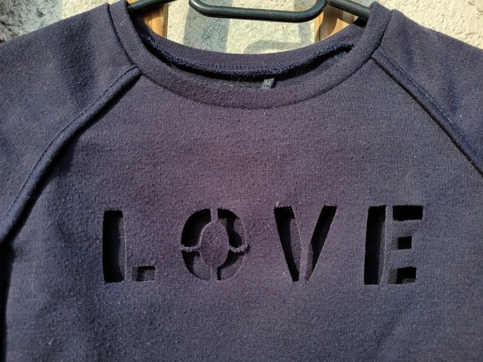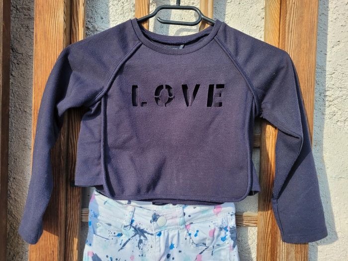 Superbe ensemble de la marque IKKS composé de : - Un pantalon blanc motif taches de peinture, bine porté mais encore en bon état - un sweat court marine, Love découpé sur la poitrine, genre de "soufflets" sur les cotés, bien porté, légèrement bouloché, taille 6 ans Pour voir mes autres vêtements 6 ans : #6ansfillemooglou #IKKSmooglou