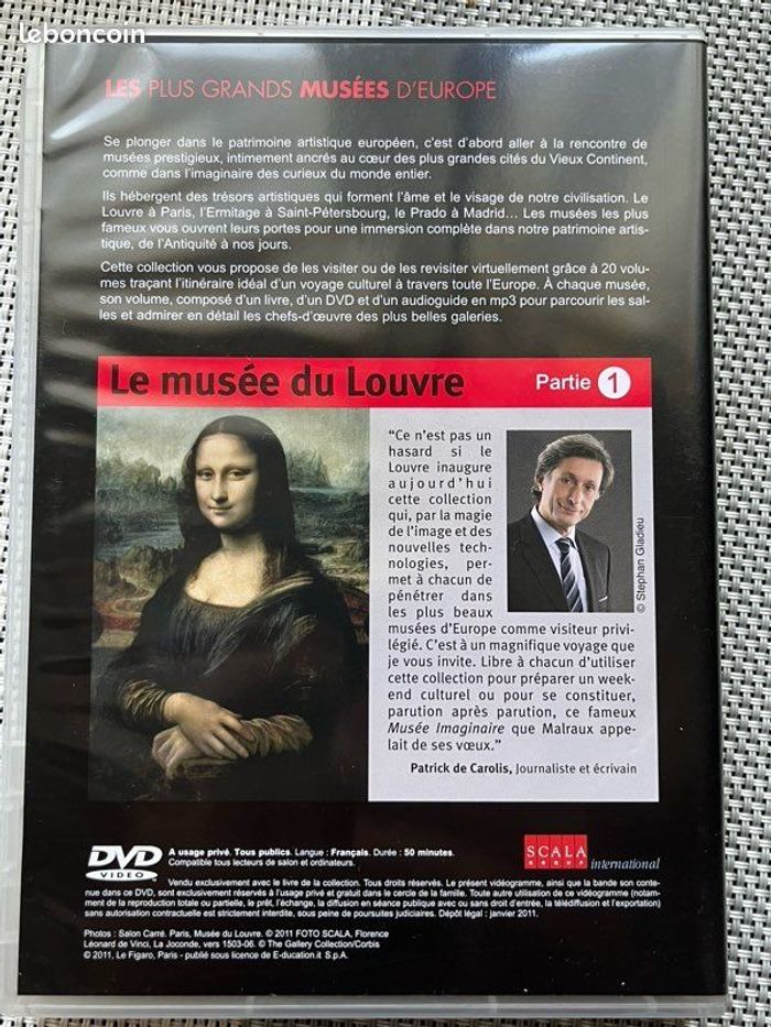 Vends DVD de la série « le plus grands musées d’Europe » : « le Musée du Louvre, partie 1 ». Le boîtier est légèrement cassé sur la partie latérale. Mais ferme parfaitement. Très bel état. Le DVD est en excellent état. Fonctionne parfaitement. Il pèse 86g. Idéal pour les amateurs de musées, fans du Louvre ou collectionneurs.