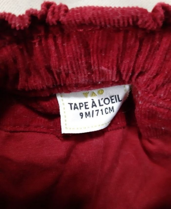 pantalon rouge bordeaux en velours côtelé, de la marque Tape à l'Œil, en taille 9 mois taille élastiquée et réglable 2 boutons décoratifs en forme de coeur sur le devant très confortable En très bon état. 🔍 D'autres vêtements en taille 9 mois disponibles. Utilisez les filtres par tailles pour faciliter vos recherches. 😉 Remise en main propre possible dans le secteur de Pont-Audemer / Beuzeville / Pont-l’Evêque / Epaignes. Envoi possible. N'hésitez pas à faire un lot pour amortir les frais de port et les frais de protection acheteur. 📦 😊 Vêtements de la taille naissance à la taille 4 ans disponibles. Jouets et livres disponibles. N'hésitez pas à me demander. Tout n'est pas encore en ligne...