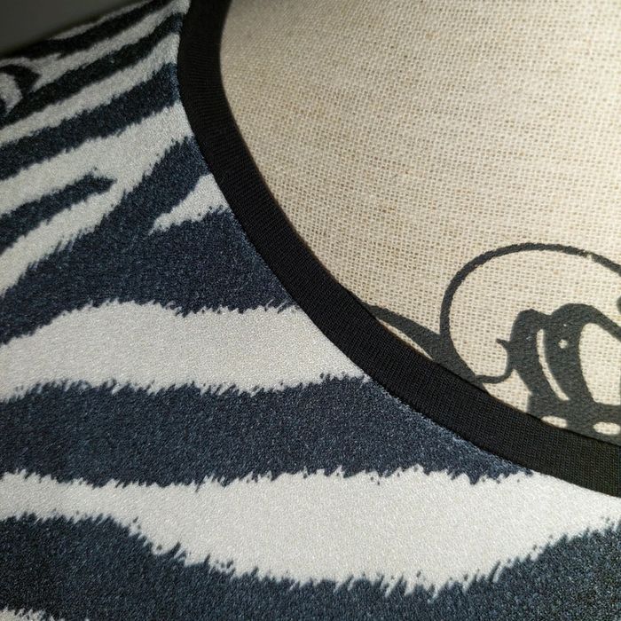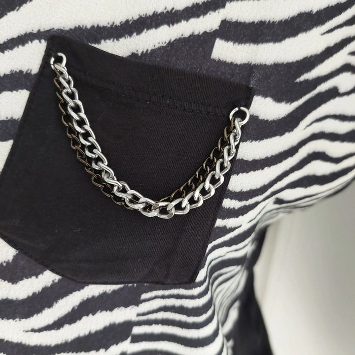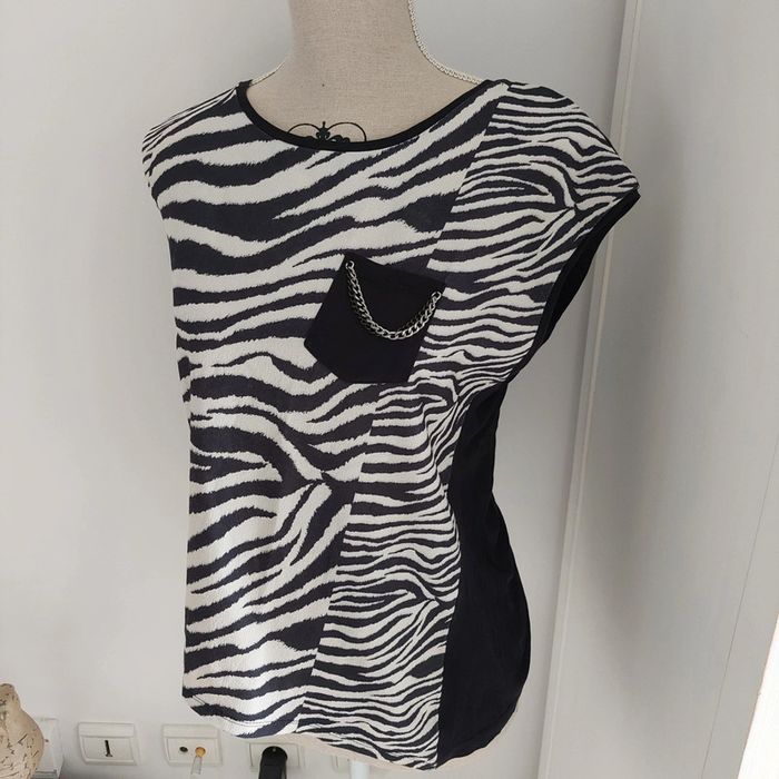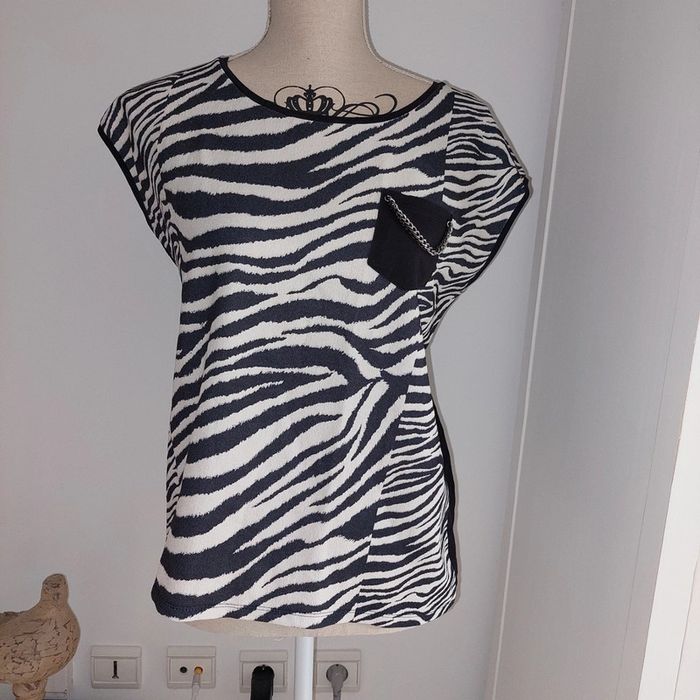 Tee-shirt manches courtes en très bon état de marque Morgan noir et blanc motif tigre leopard avec une poche et chaîne argentée sur le devant