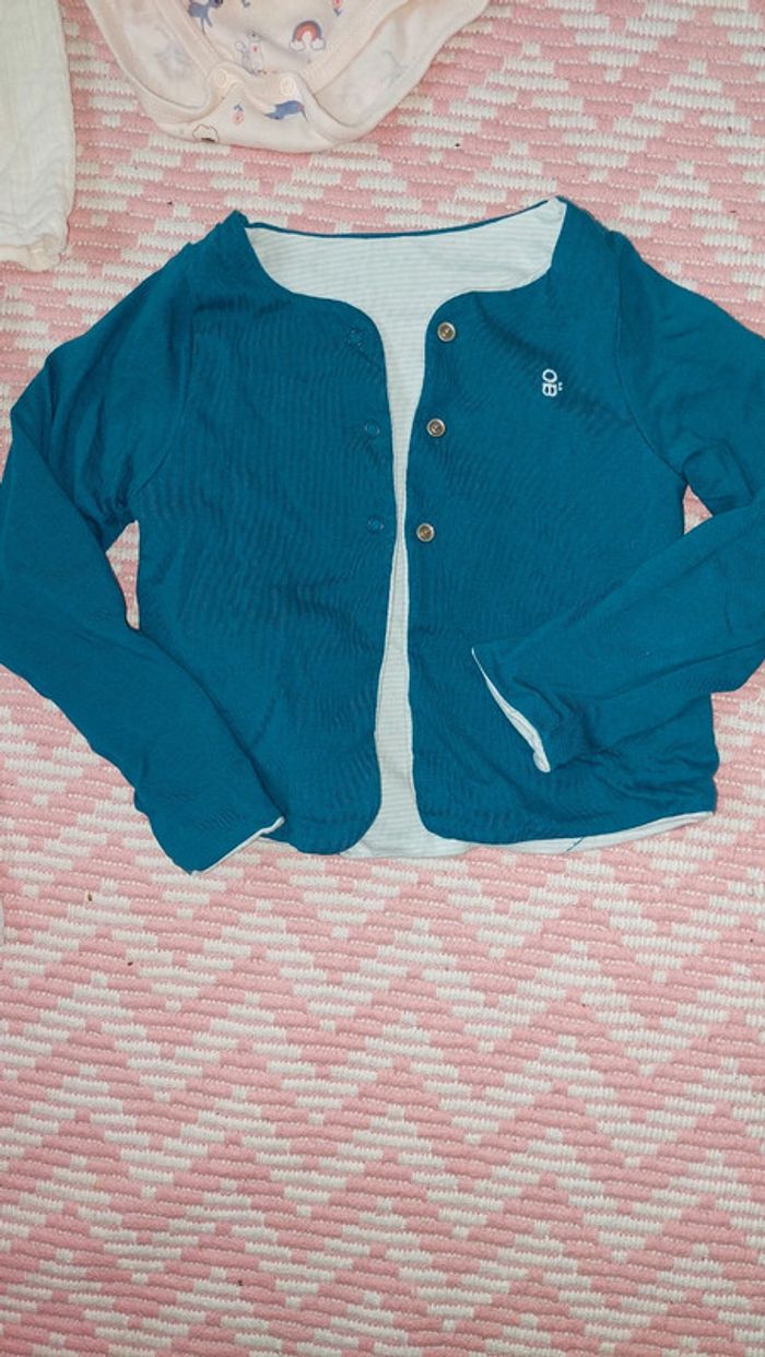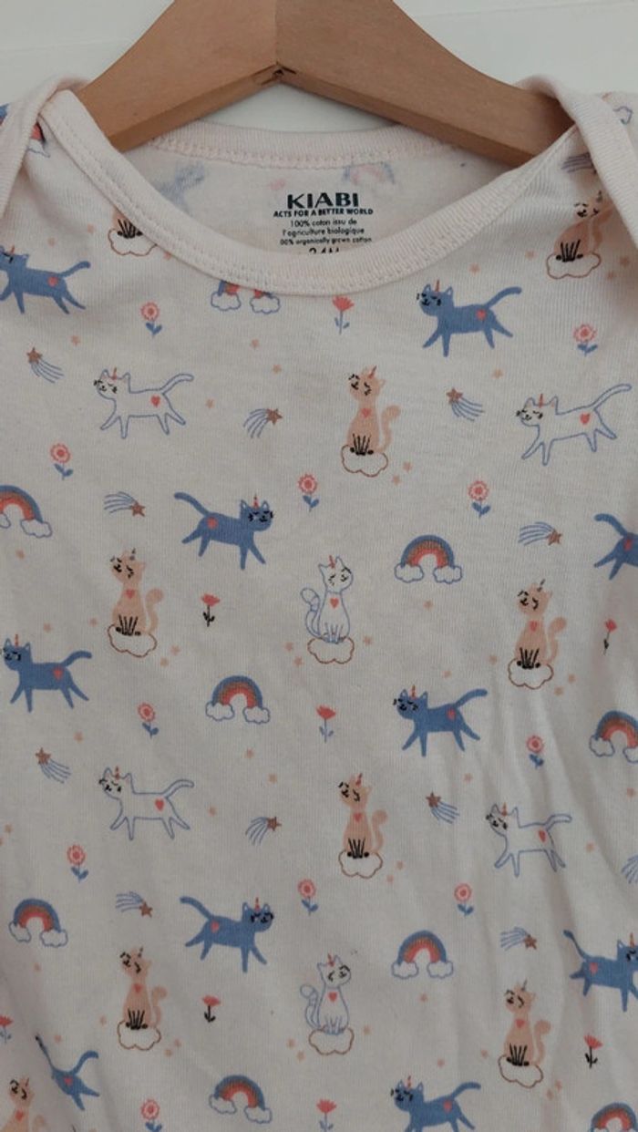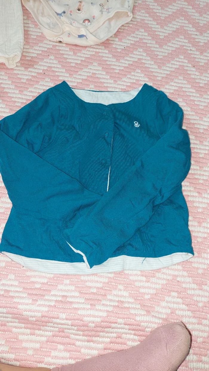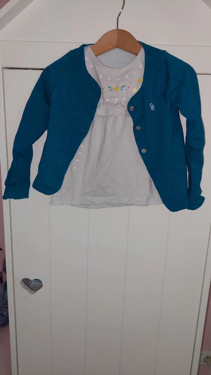 Lot de 4 vêtements 23-24 mois bébé fille âgé 23-24 mois 86 cm: ⁃ 1 gilet coton réversible état neuf Obaibi bleu canard d'un côté - 1 robe coton écru blanc cassé choo baby by kloane état neuf - 1 tee-shirt manches courtes Sergent Major excellent état - 1 body imprimé chats état neuf coton biologique 24 mois 83-89 cm 12kgs